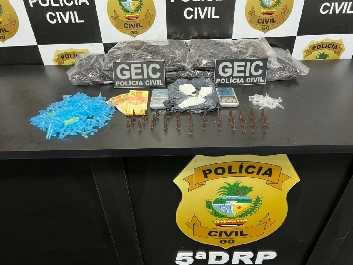 A Polícia Civil de Goiás, por intermédio do Grupo Especial de Investigações Criminais (Geic) de Luziânia – 5ª DRP, deu cumprimento nesta quinta-feira (27) a mandados de busca e apreensão e de prisão temporária em uma residência localizada no Distrito do Jardim Ingá, em Luziânia. No imóvel, os policiais encontraram cocaína tanto “a granel” (pura, para ser misturada), quanto já fracionada em pinos prontos para a venda. Além da droga, havia vasto material para embalagem, confirmando a destinação comercial. O local de armazenagem da droga ficava estrategicamente instalado nas imediações de uma escola, uma igreja e um posto de saúde, fato que agrava a pena do crime (tráfico majorado).