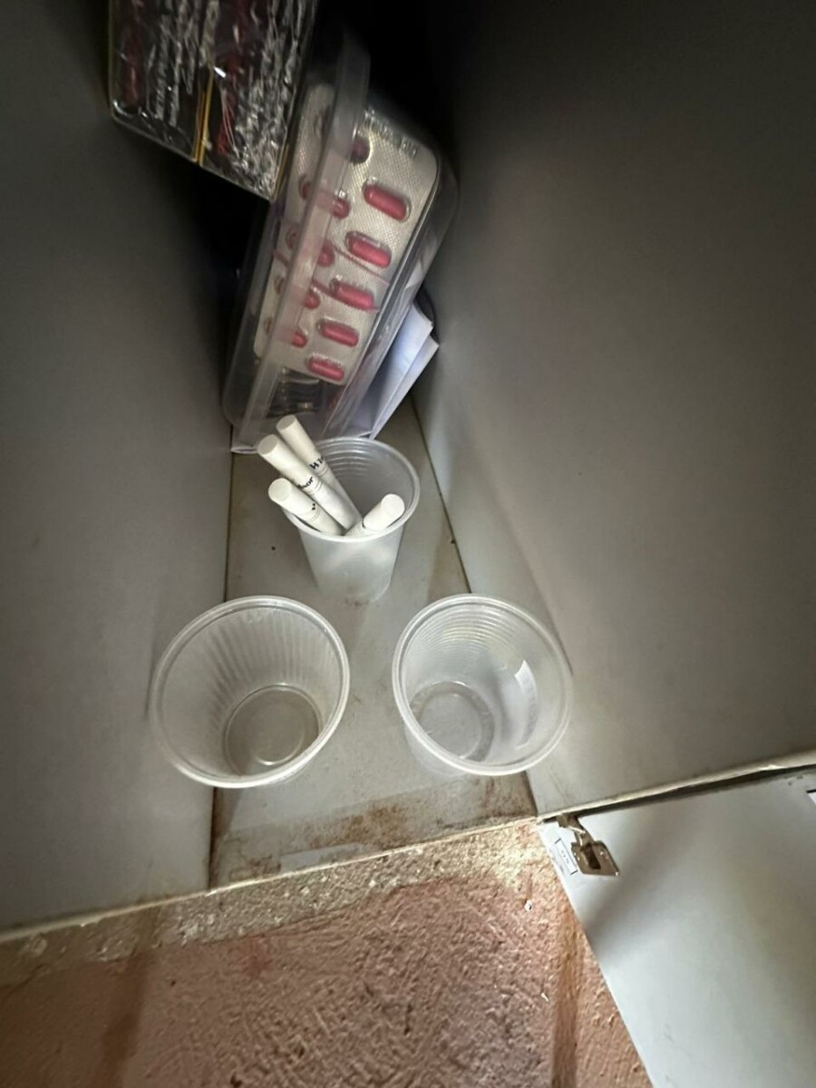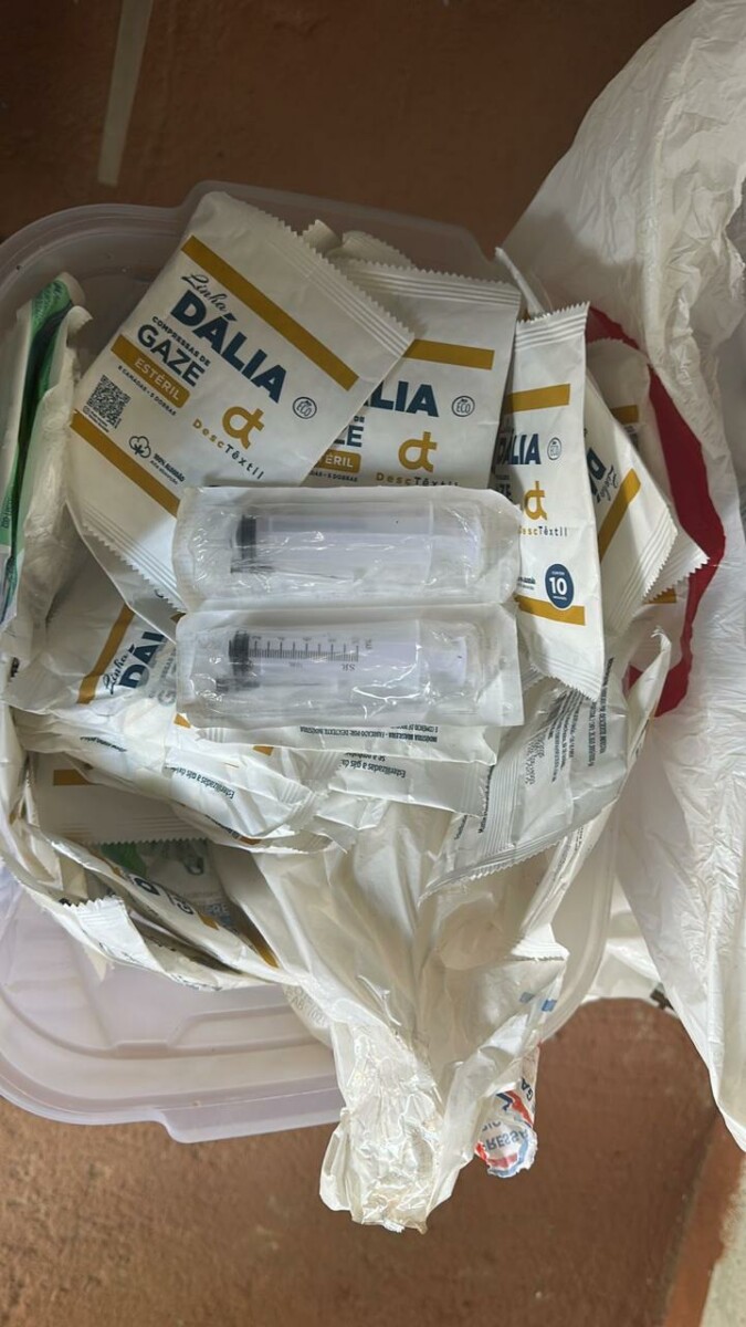 Durante a fiscalização, foram encontrados e apreendidos diversos medicamentos controlados armazenados de forma irregular, sem controle de validade, prescrição ou acompanhamento de profissional habilitado. Também foram localizadas carteiras de cigarro de origem estrangeira, sem documentação fiscal.