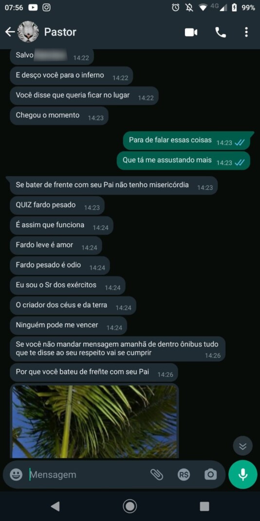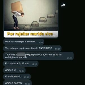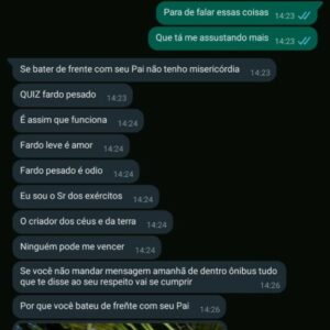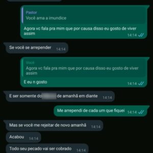 Em conversas de WhatsApp, após os fatos, na intenção de praticar novos atos libidinosos, mesmo com a negativa da vítima, o autor proferiu diversas ameaças religiosas à vítima e sua família. O pastor se autodenominava como “Yahuha” (Deus) e praticava verdadeiro terror psicológico contra a vítima, afirmando que seu marido “seria recolhido (morto a mando de Deus)”, que a vítima não seria salva, nem sua filha, que se o rejeitasse, seria punida por Deus.