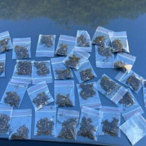 Na residência, em um barracão do mesmo lote, os policiais civis encontraram o suspeito. No local foram apreendidos 31 porções de material vegetal aparentando ser maconha, acondicionadas separadamente em saquinhos zip lock prontos para mercância, e uma porção de material em pó na cor branca, aparentando ser cocaína, bem como R$ 224 em espécie, além de vários saquinhos vazios zip lock e um aparelho celular. Em cima da geladeira, também havia um simulacro de arma de fogo tipo pistola, uma espada facão, além de sete porções de material vegetal esverdeado, acondicionadas separadamente em sacos plásticos zip lock, aparentando ser maconha. O suspeito foi preso em flagrante por tráfico de drogas.