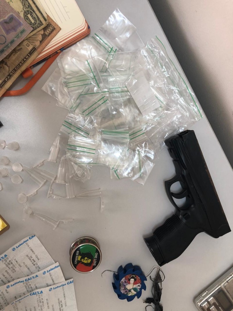 Os policiais descobriram que numa residência do Jardim Bela Vista, em Goiânia, o suspeito ocultava 10 gramas de cocaína, balança de precisão, 300 reais em dinheiro (inclusive moedas estrangeiras), mais de 60 embalagens plásticas para comércio de drogas, além de 15 “pinos” plásticos que tinham a mesma finalidade. Também foi apreendido um simulacro de arma de fogo e agendas com anotação da contabilidade da venda de drogas.