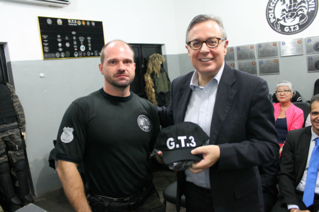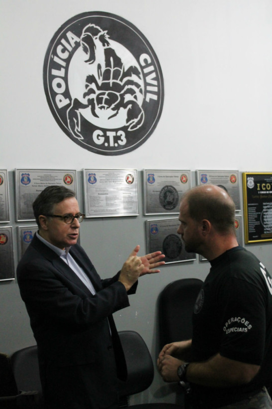 O secretário estadual de Segurança Pública e Administração Penitenciária, Ricardo Balestreri, realizou a primeira visita á base do Grupo Tático-3 (GT-3) da Polícia Civil de Goiás no final da tarde de quinta-feira (16). Recepcionado pelo delegado do grupo tático, André Ganga, Balestreri estava acompanhado do superintendente de Polícia Judiciária, delegado Alécio Moreira, e pelo gerente de Análise Criminal da PCGO, delegado Murilo Martins.