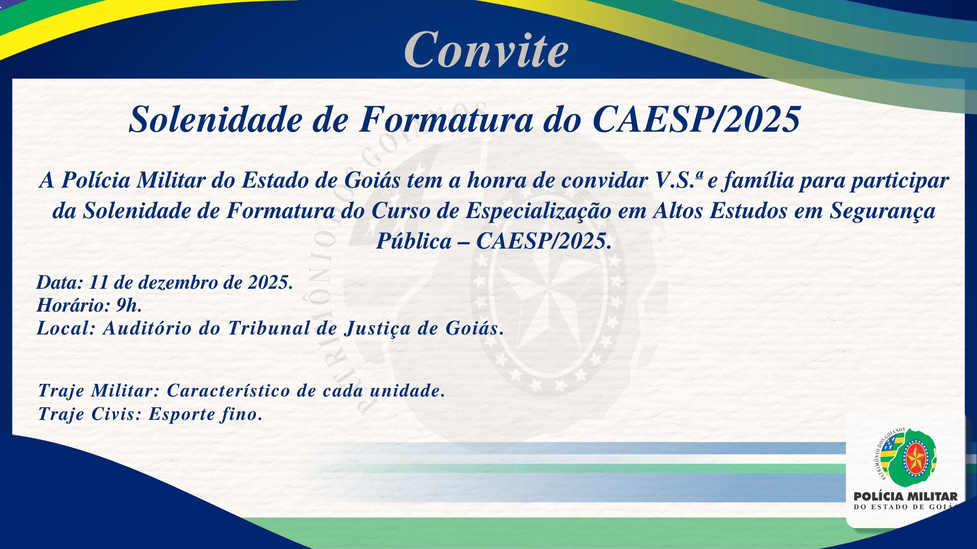 A Polícia Militar do Estado de Goiás tem a honra de convidar V.S.ª e família para participar da Solenidade de Formatura do Curso de Especialização em Altos Estudos em Segurança...