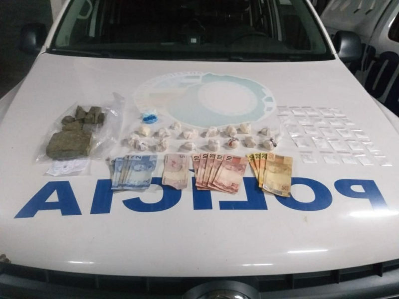 Chegando ao local os Policiais Militares abordaram o infrator, e sob sua posse aprenderam dinheiro oriundo do tráfico de drogas, cocaína, maconha, crack e comprimidos de ecstasy, que estavam embalados em sacos plásticos.