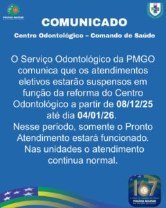 O Serviço Odontológico da Polícia Militar de Goiás comunica que os atendimentos efetivos estarão suspensos em função da reforma do Centro Odontológico a partir de 08/12/2025 até o dia 04/01/2026.
