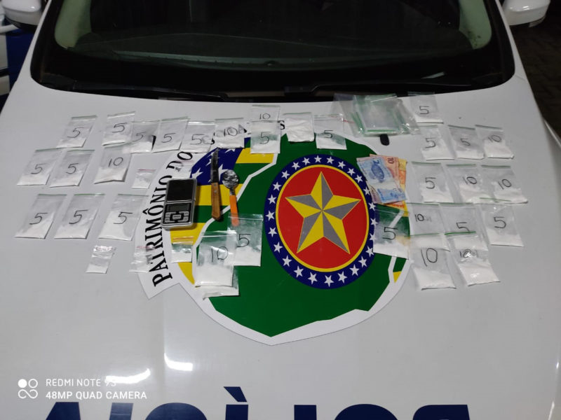 Com apoio do CPU da Unidade e de outra equipe, o infrator foi abordado, e com ele e sua companheira, durante a revista veicular, foram encontradas várias porções de cocaína que estavam embaladas em pequenas frações (em sacos plásticos), uma balança digital e apetrechos que estavam sendo utilizados para o fracionamento do alucinógeno.