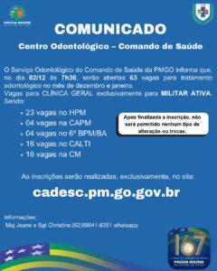 O Serviço Odontológico do Comando de Saúde da PMGO informa que, no dia 02/12 às 7h30, serão abertas 63 vagas para tratamento odontológico no mês de dezembro e janeiro.