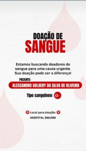 Neste momento delicado, a solidariedade torna-se essencial. O militar precisa de doadores do tipo sanguíneo O negativo (O−), que podem realizar a doação no Hospital Encore. Cada gesto voluntário representa uma possibilidade real de recuperação e continuidade do tratamento.