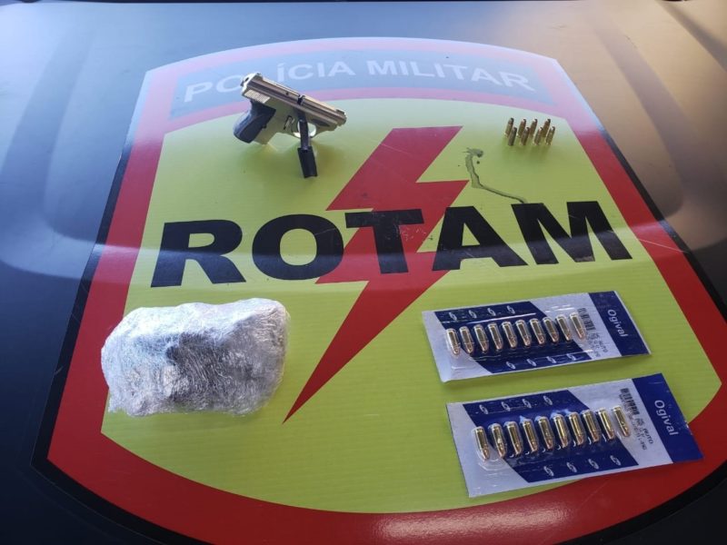 Chegando ao local os Militares abordaram uma infratora e sob sua posse aprenderam uma arma de fogo ilegal (pistola) calibre 635, 28 munições e uma porção grande de skunk, que no mundo do crime é vulgarmente conhecida como super maconha, devido seu alto poder alucinógeno.