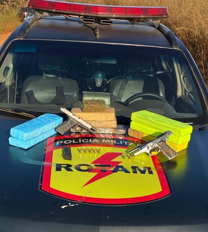 Com os transgressores os Militares recuperaram um veículo produto de roubo, apreenderam oito porções grandes (tabletes) de maconha, duas armas de fogo ilegais (tipo pistola), sendo um dos armamentos capaz de efetuar disparos ininterruptos (como uma metralhadora) e uma pistola parabélum, ambas em calibre 9MM.