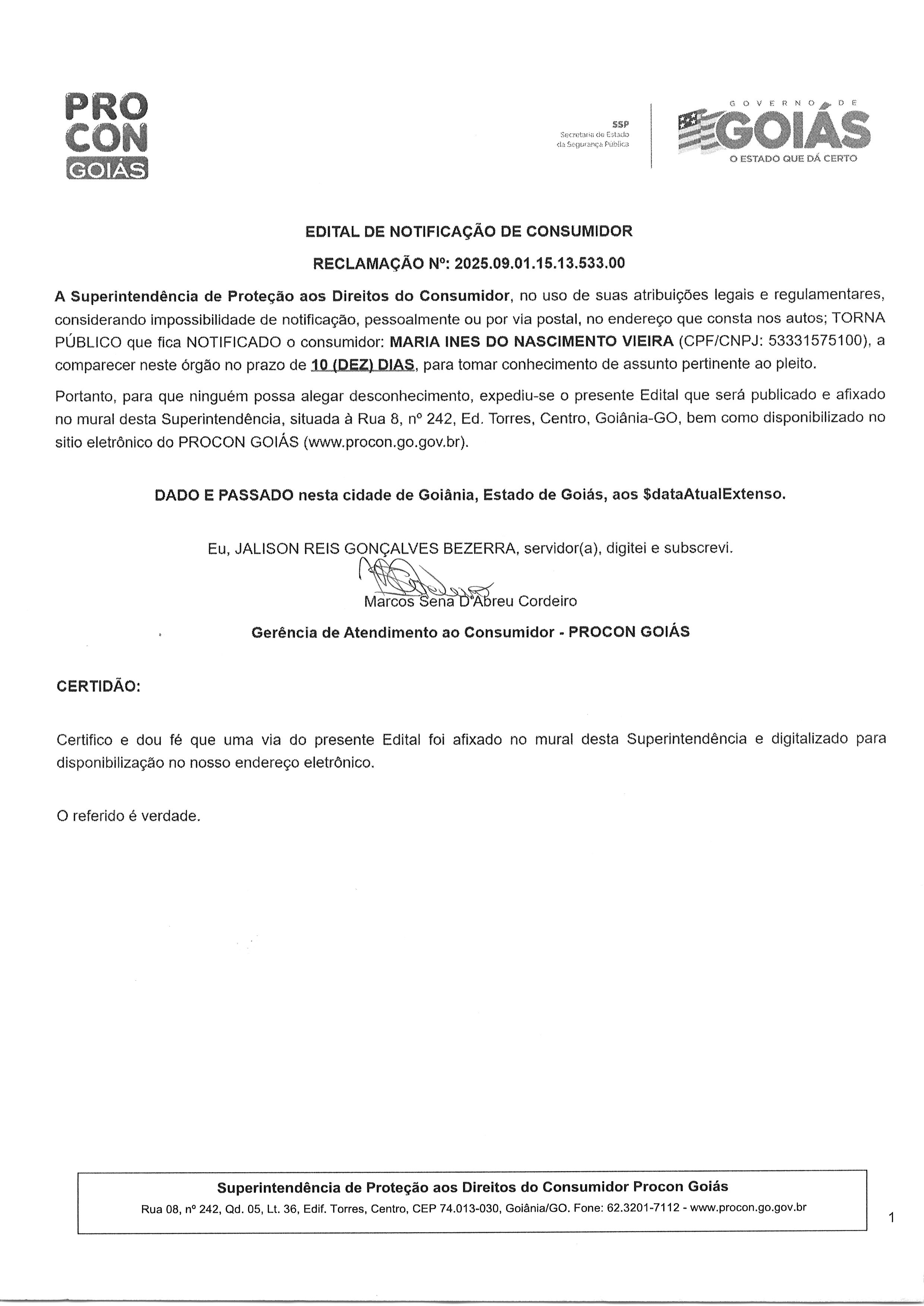 Termo de Notificação de Nº 2025.09.01.15.13.533.00, Consumidor MARIA INES DO NASCIMENTO VIEIRA Última Atualização em 3 de março de 2026 Categoria Consumidor, Editais de Notificação