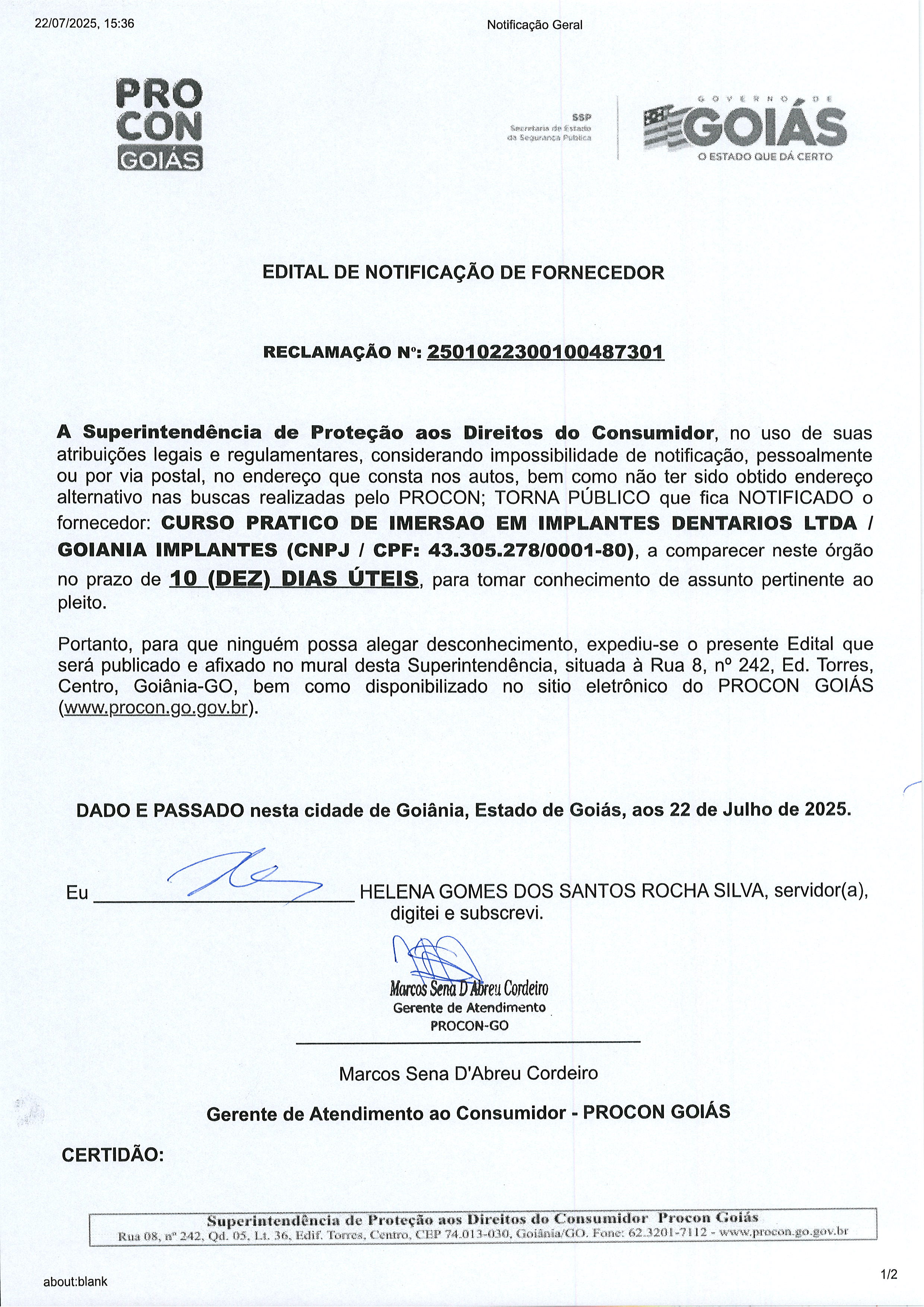 Edital de Notificação de Nº 2501022300100487301 , Fornecedor GOIANIA IMPLANTES Última Atualização em 31 de julho de 2025 Categoria Editais de Notificação, Fornecedor