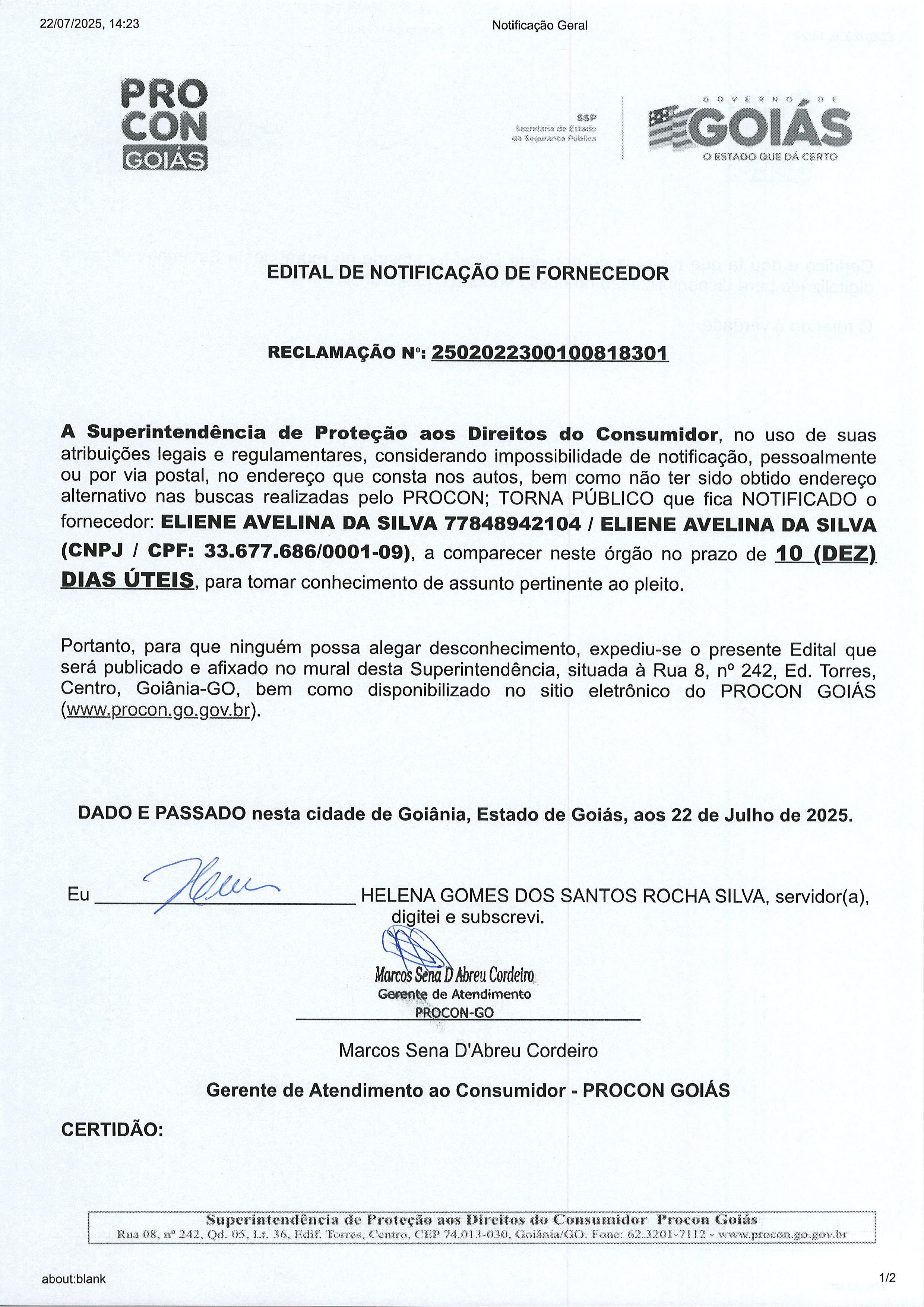 Edital de Notificação de Nº 2502022300100818301 , Fornecedor ELIENE AVELINA DA SILVA Última Atualização em 31 de julho de 2025 Categoria Editais de Notificação, Fornecedor