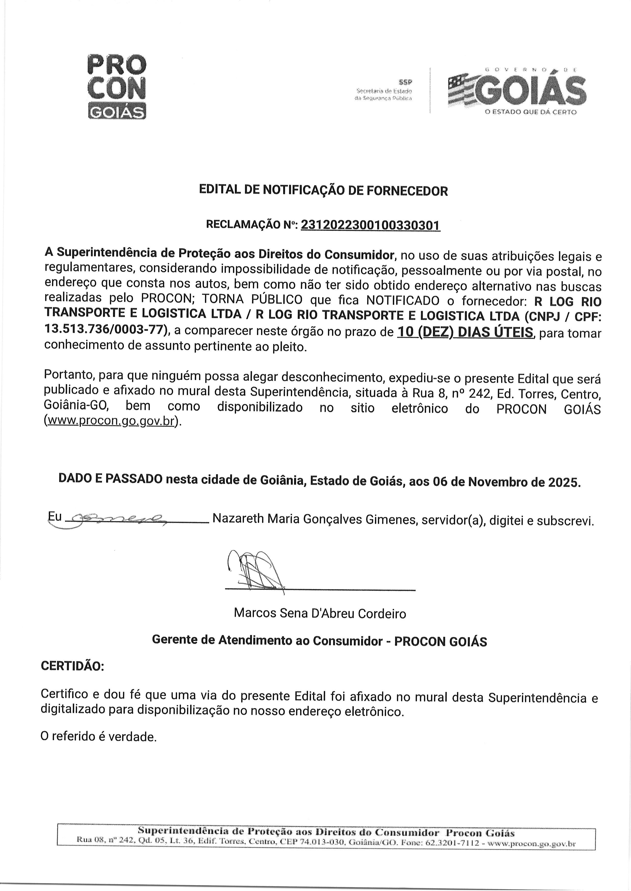 EDITAL DE NOTIFICACAO FORNECEDOR N° 2312022300100330301 FORNECEDOR R LOG RIO TRANSPORTE Última Atualização em 13 de novembro de 2025 Categoria Editais de Notificação, Fornecedor