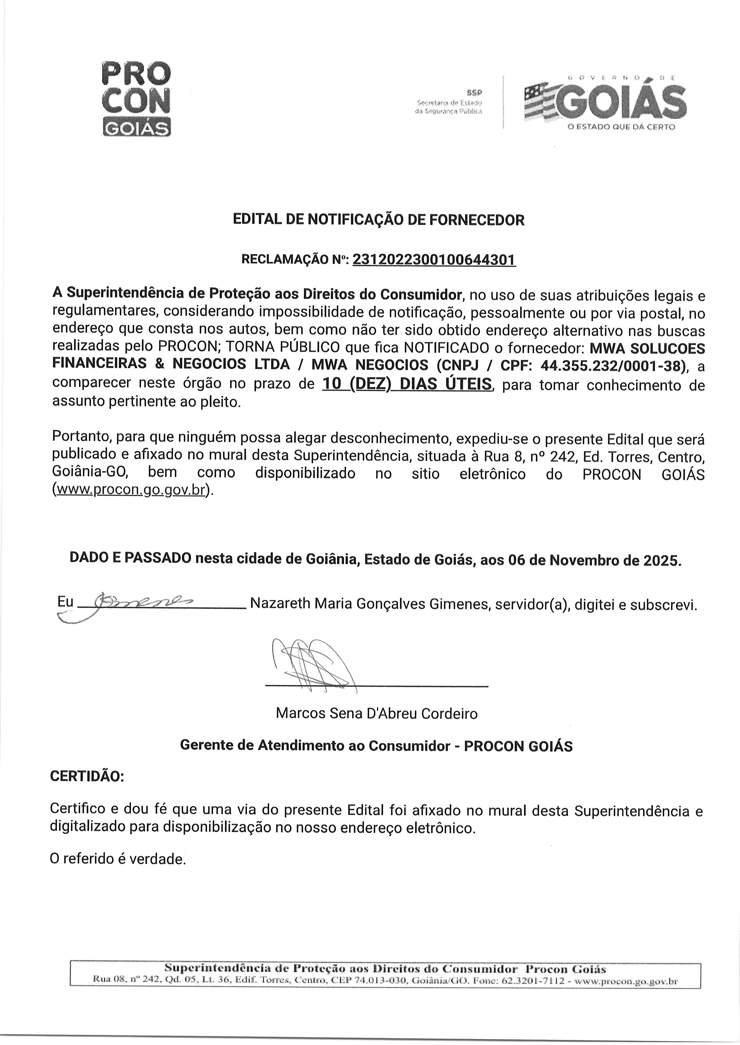 EDITAL DE NOTIFICACAO FORNECEDOR N° 2312022300100644301 FORNECEDOR MWA SOLUCOES FINANCEIRAS Última Atualização em 13 de novembro de 2025 Categoria Editais de Notificação, Fornecedor