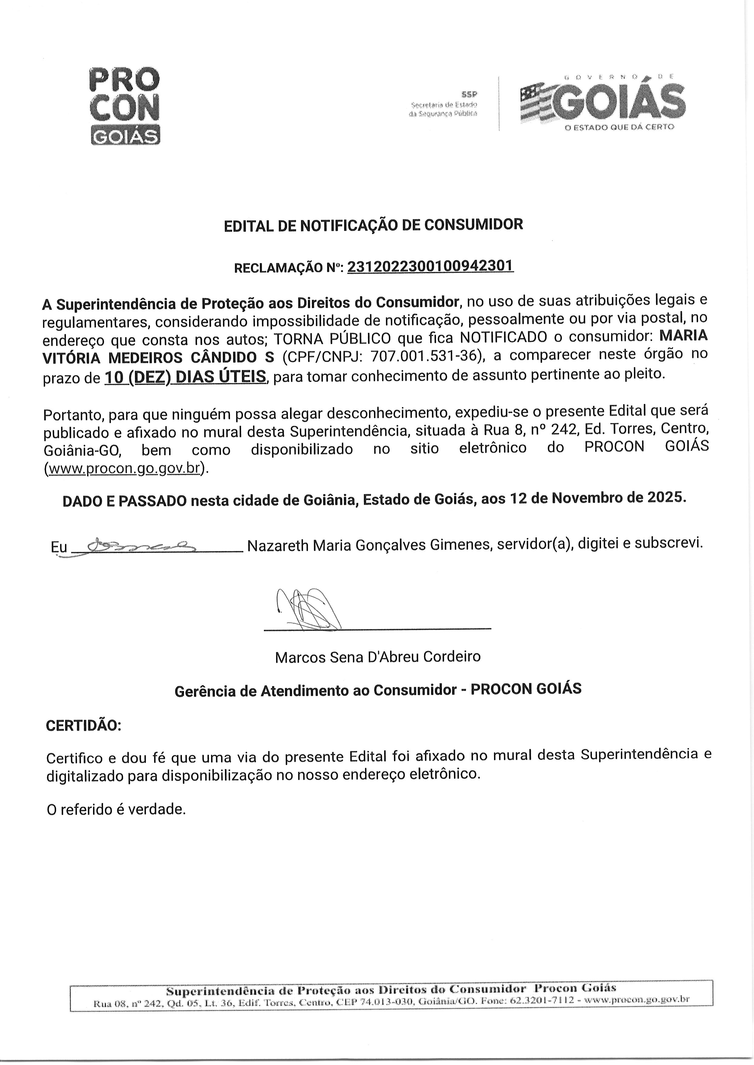 EDITAL DE NOTIFICACAO FORNECEDOR N° 2312022300100942301 FORNECEDOR MARIA VITORIA MEDEIROS CANDIDO Última Atualização em 19 de novembro de 2025 Categoria Editais de Notificação, Fornecedor