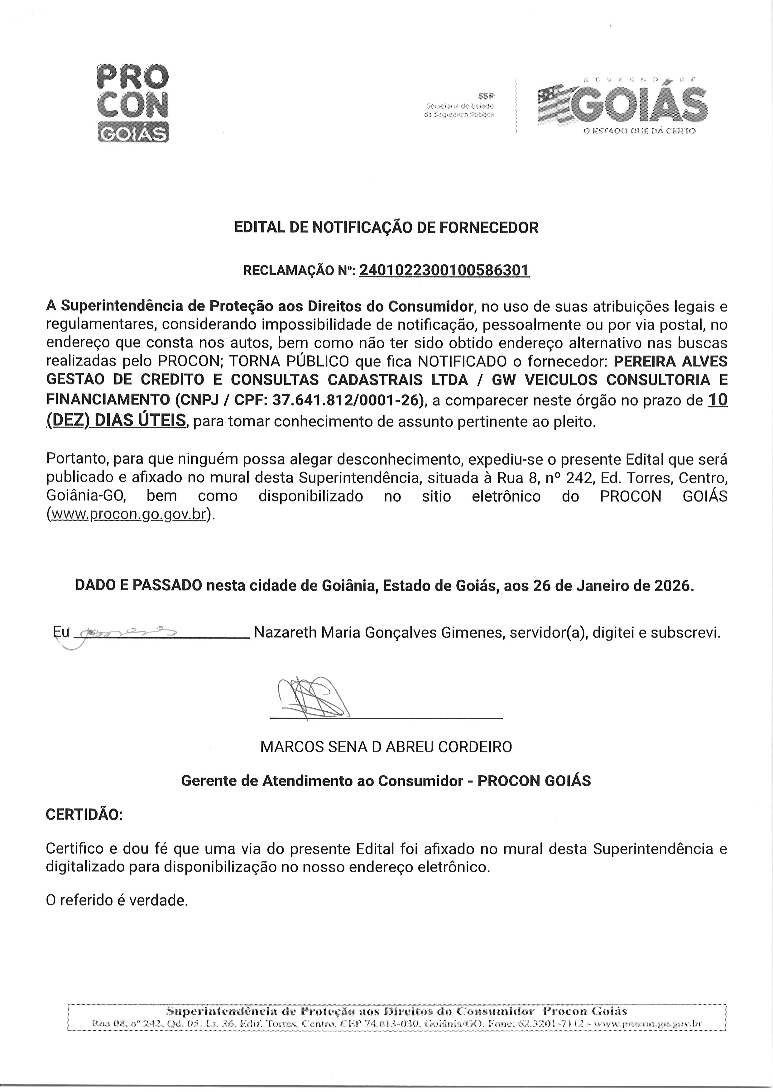 EDITAL DE NOTIFICACAO FORNECEDOR N° 2401022300100586301 PEREIRA ALVES GESTAO DE CREDITO E CONSULTAS Última Atualização em 3 de fevereiro de 2026 Categoria Editais de Notificação, Fornecedor