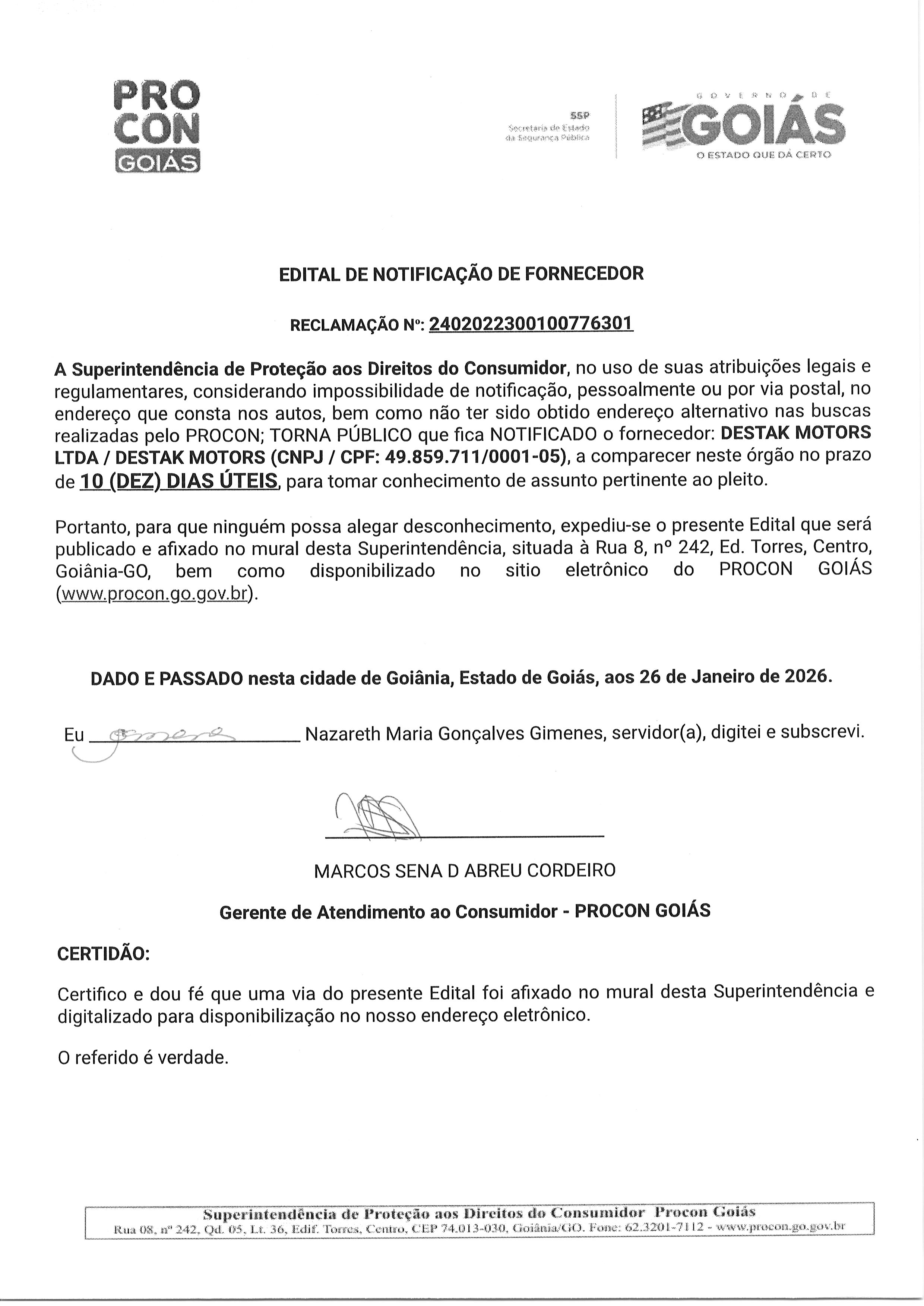 EDITAL DE NOTIFICACAO FORNECEDOR N° 2402022300100776301 DESTAK MOTORS LTDA Última Atualização em 3 de fevereiro de 2026 Categoria Editais de Notificação, Fornecedor