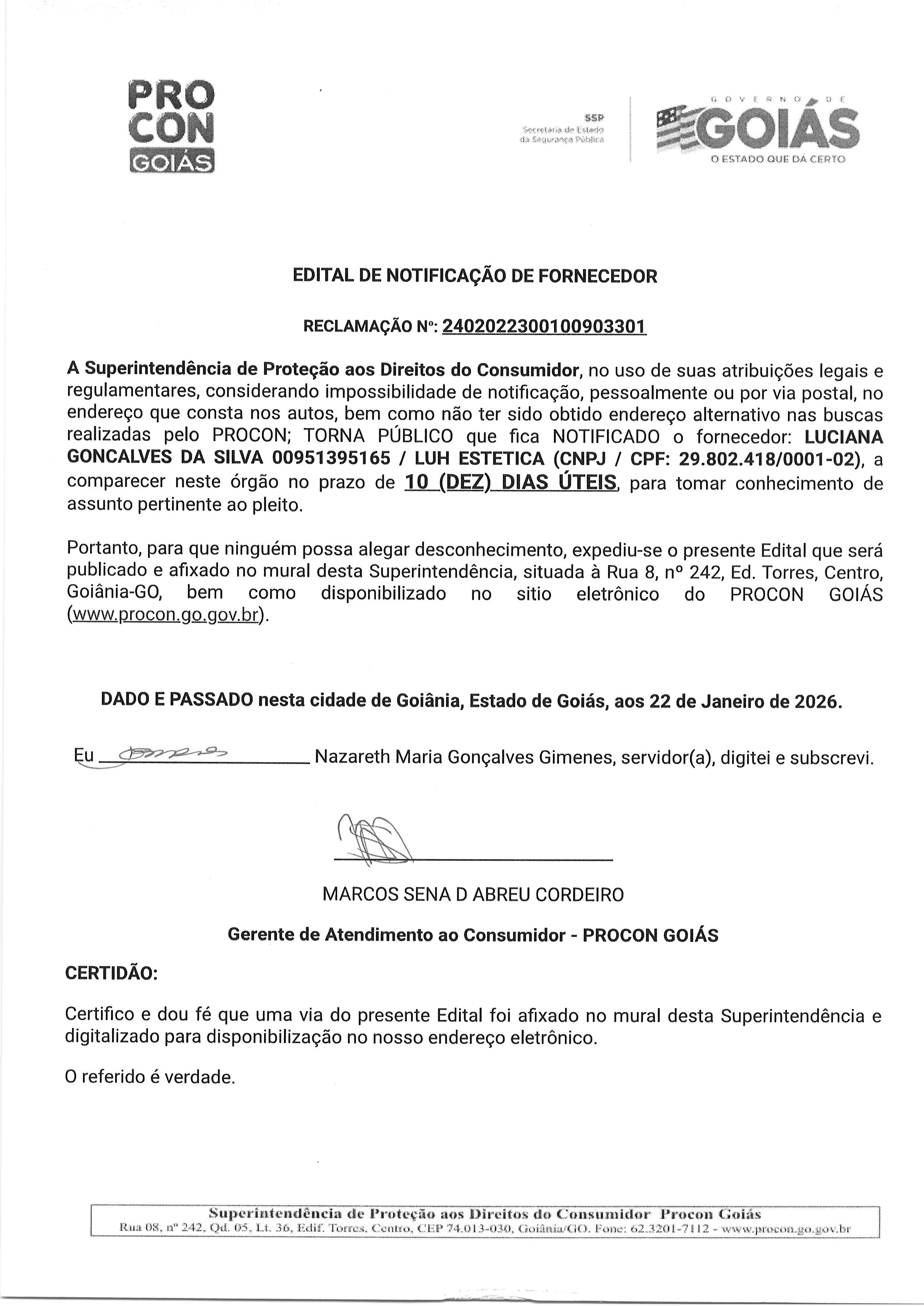 EDITAL DE NOTIFICACAO FORNECEDOR N° 2402022300100903301 LUCIANA GONCALVES DA SILVA Última Atualização em 3 de fevereiro de 2026 Categoria Editais de Notificação, Fornecedor
