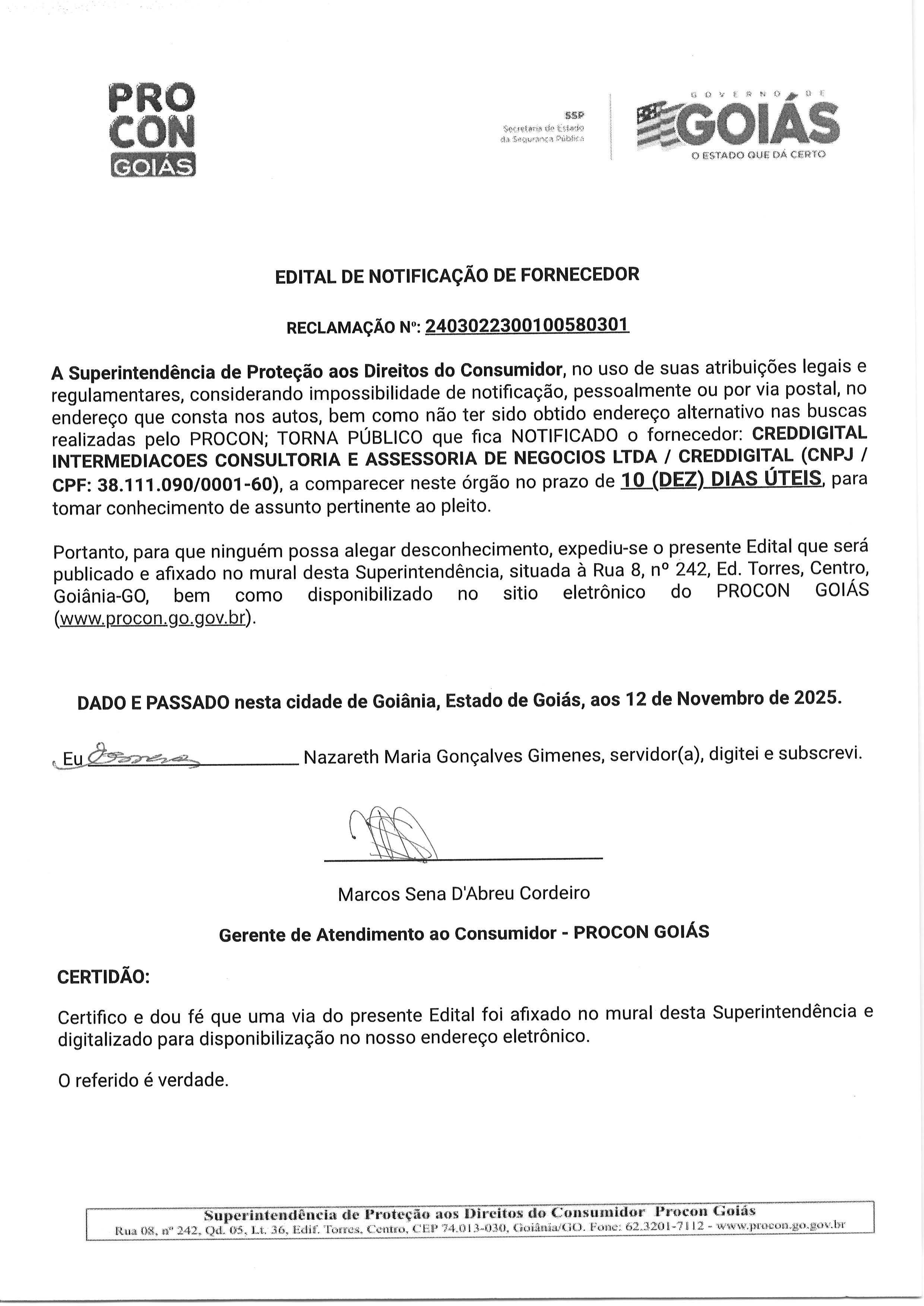 EDITAL DE NOTIFICACAO FORNECEDOR N° 2403022300100580301 FORNECEDOR CREDDIGITAL INTERMEDIACOES CONSULTORIA Última Atualização em 19 de novembro de 2025 Categoria Editais de Notificação, Fornecedor