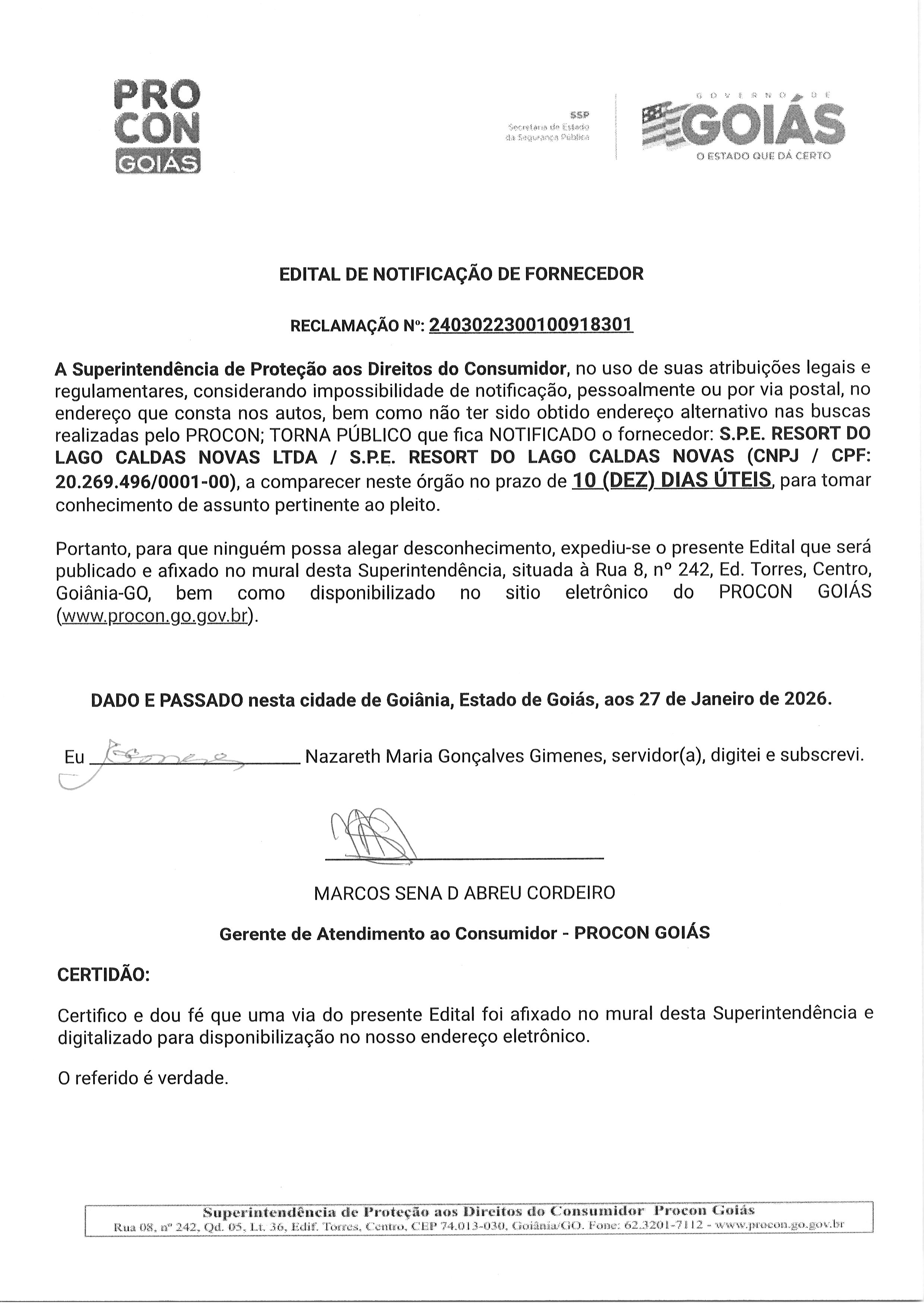 EDITAL DE NOTIFICACAO FORNECEDOR N° 2403022300100918301 S.P.E. RESORT DO LAGO CALDAS NOVAS Última Atualização em 3 de fevereiro de 2026 Categoria Editais de Notificação, Fornecedor