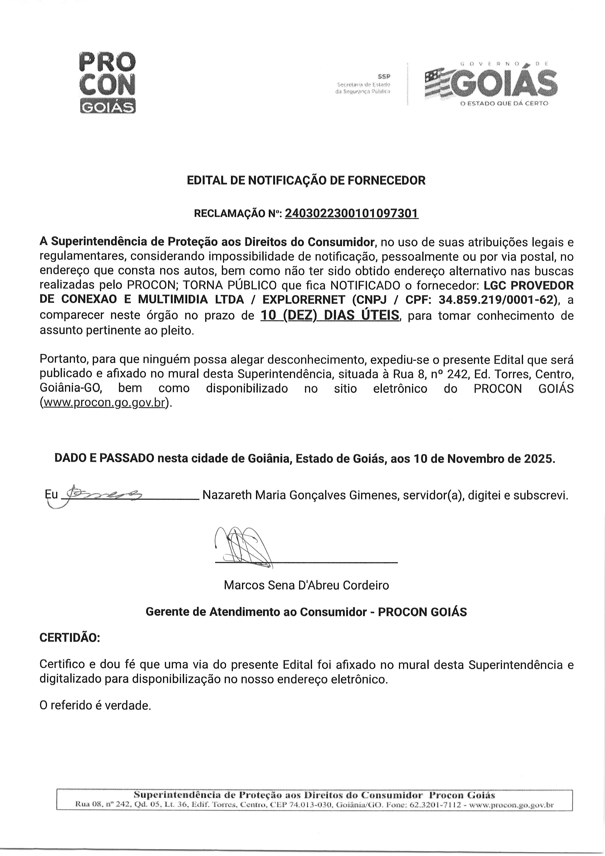 EDITAL DE NOTIFICACAO FORNECEDOR N° 2403022300101097301 FORNECEDOR LGC PROVEDOR DE CONEXAO E MULTIMIDA Última Atualização em 18 de novembro de 2025 Categoria Editais de Notificação, Fornecedor