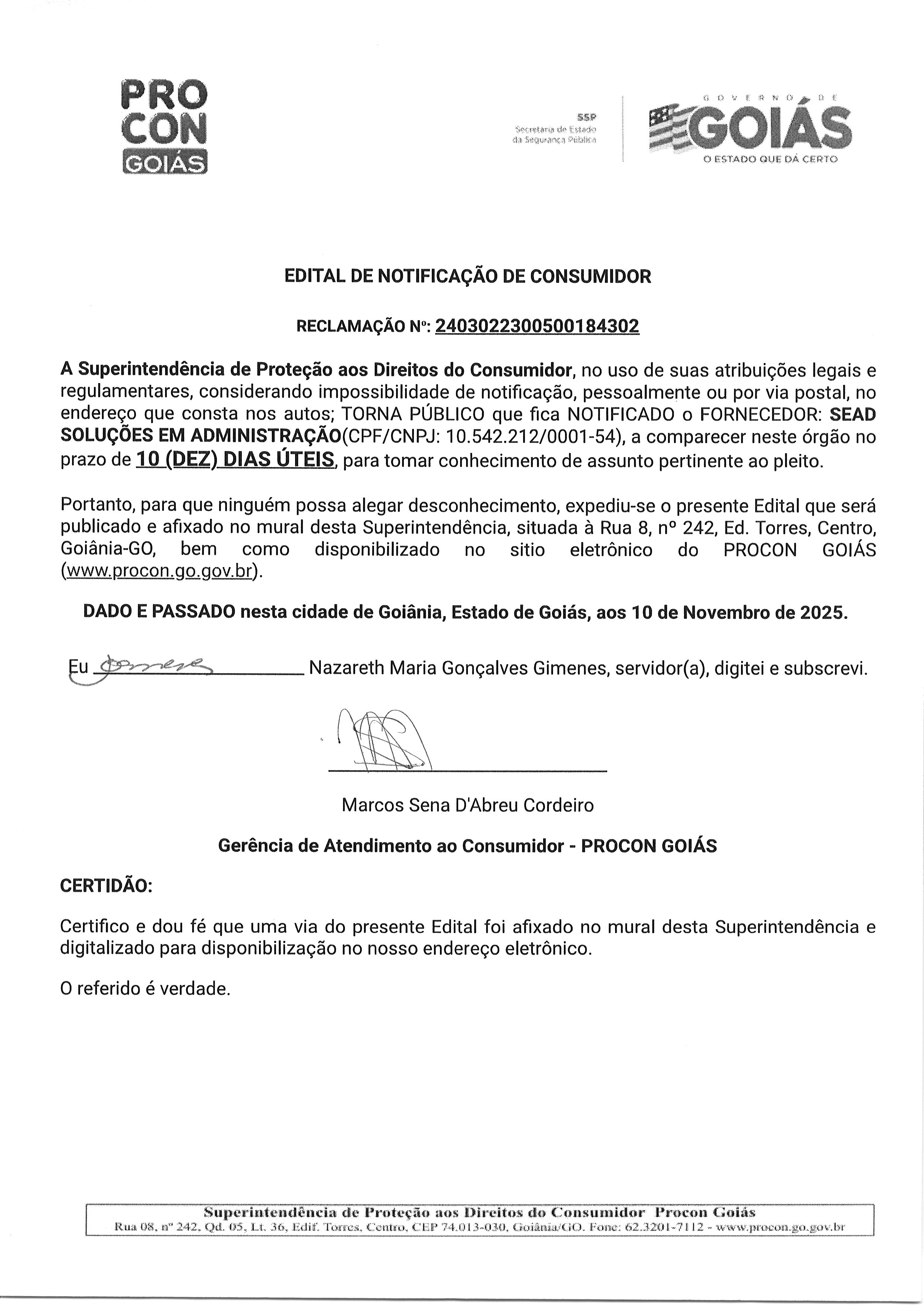 EDITAL DE NOTIFICACAO FORNECEDOR N° 2403022300500184302 FORNECEDOR SEAD SOLUCOES Última Atualização em 18 de novembro de 2025 Categoria Editais de Notificação, Fornecedor