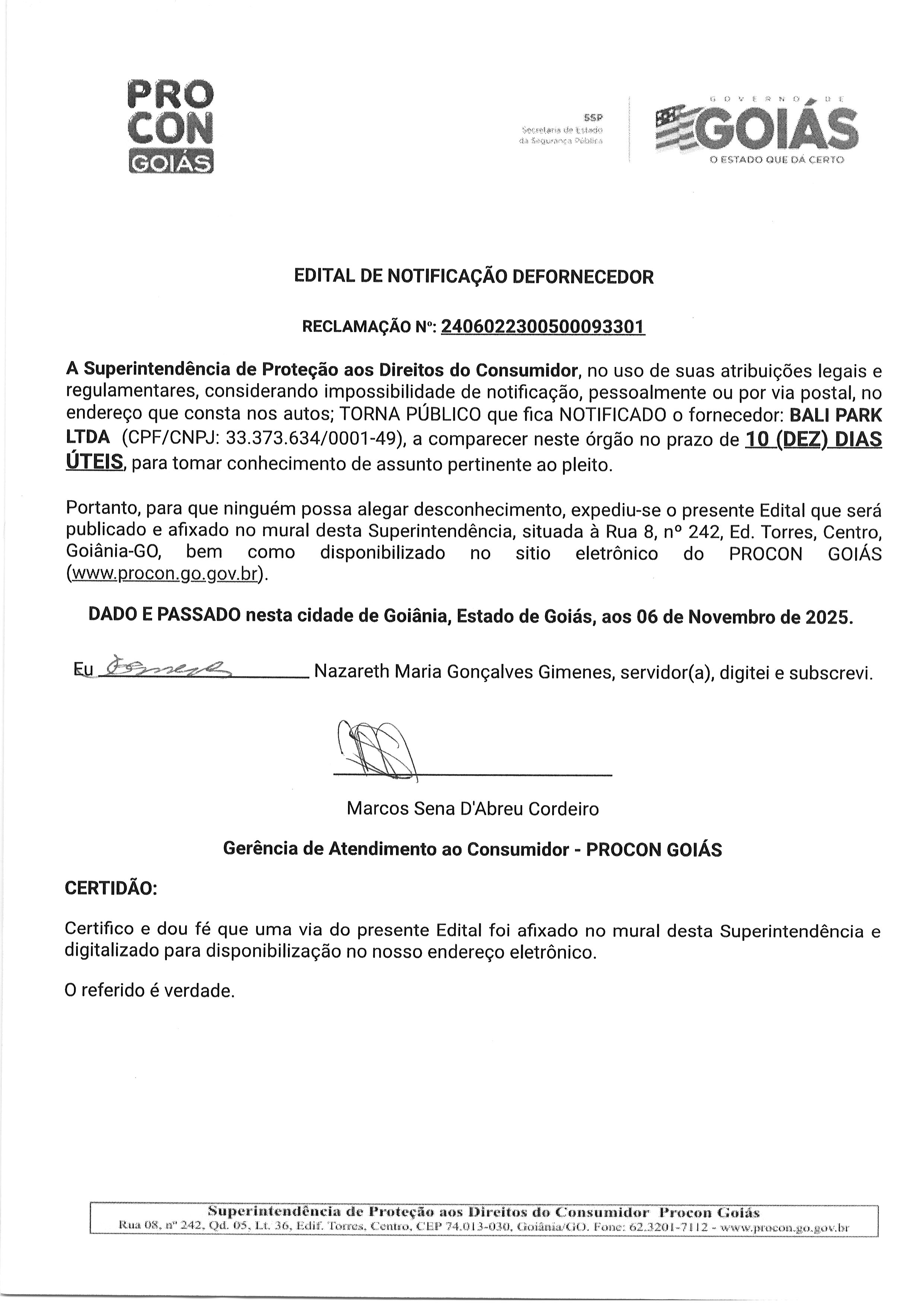 EDITAL DE NOTIFICACAO FORNECEDOR N° 2406022300500093301 FORNECEDOR BALI PARK Última Atualização em 13 de novembro de 2025 Categoria Editais de Notificação, Fornecedor
