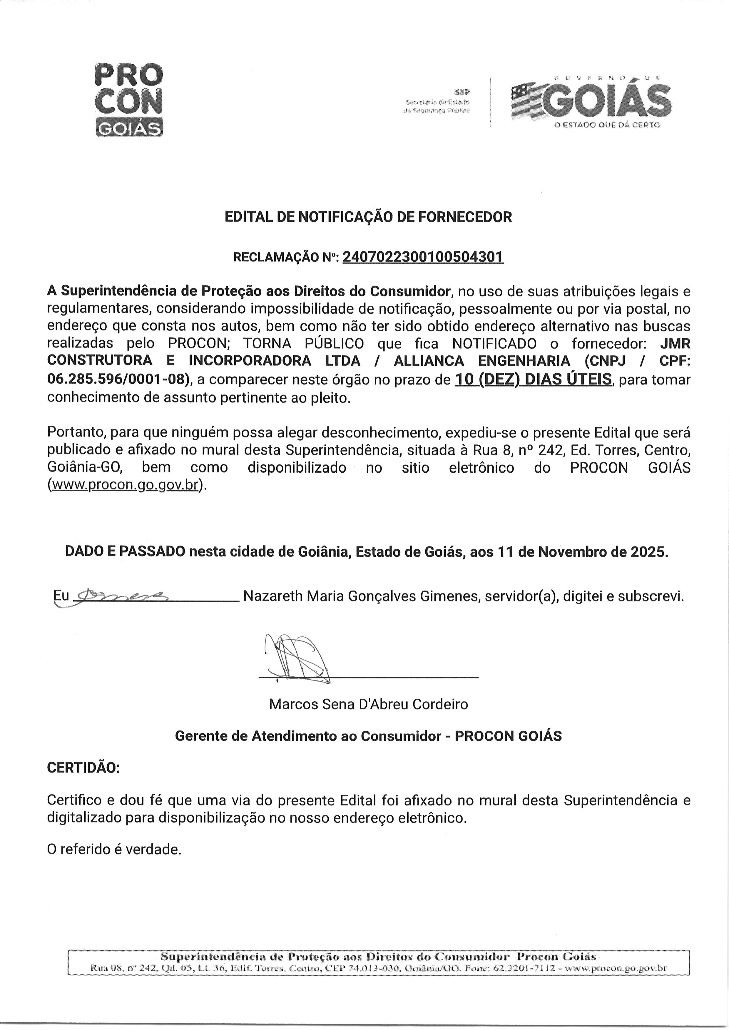 EDITAL DE NOTIFICACAO FORNECEDOR N° 2407022300100504301 FORNECEDOR JMR CONSTRUTURORA Última Atualização em 18 de novembro de 2025 Categoria Editais de Notificação, Fornecedor