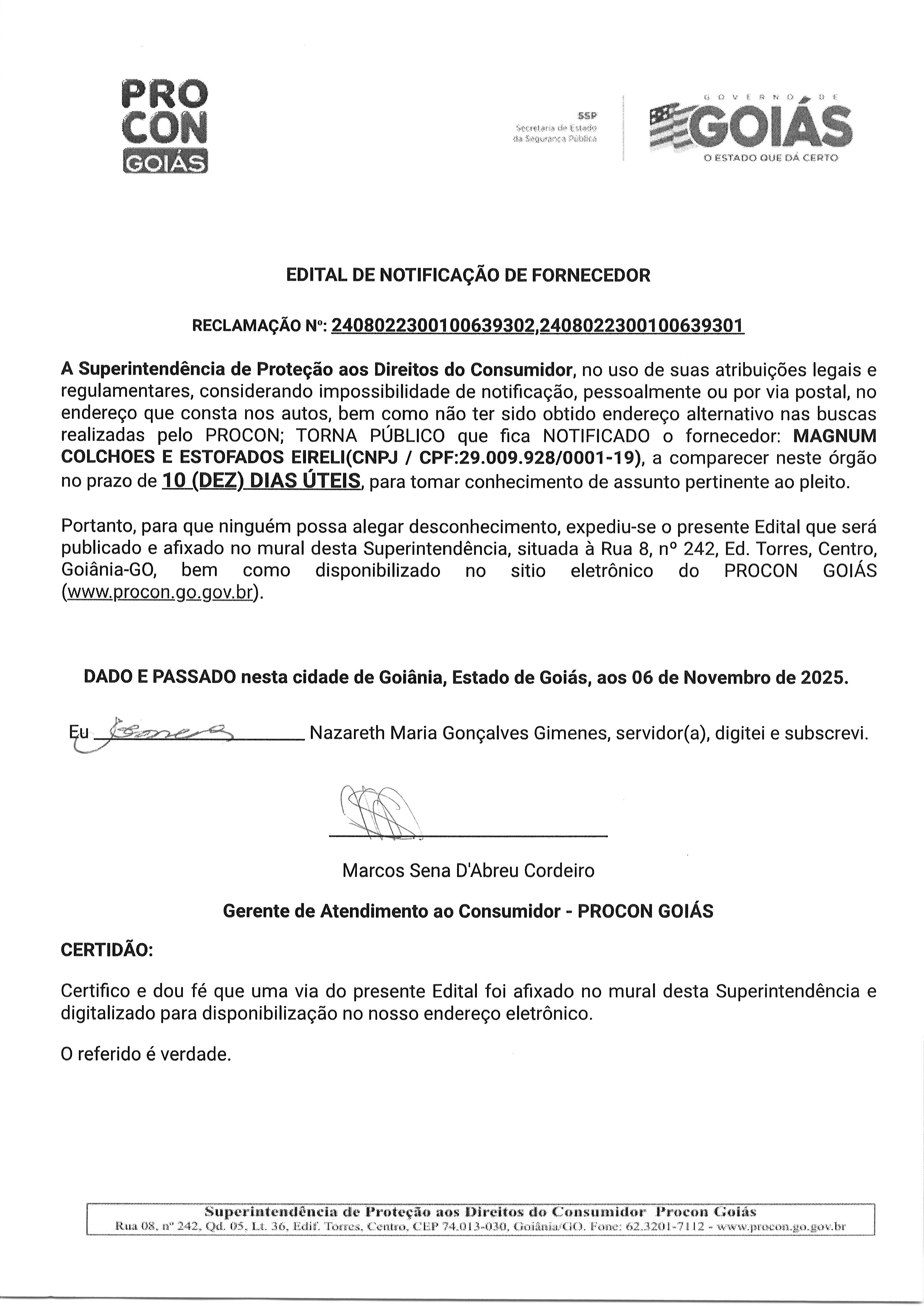 EDITAL DE NOTIFICACAO FORNECEDOR N° 2408022300100639302 FORNECEDOR MAGNUM COLCHOES Última Atualização em 12 de novembro de 2025 Categoria Editais de Notificação, Fornecedor