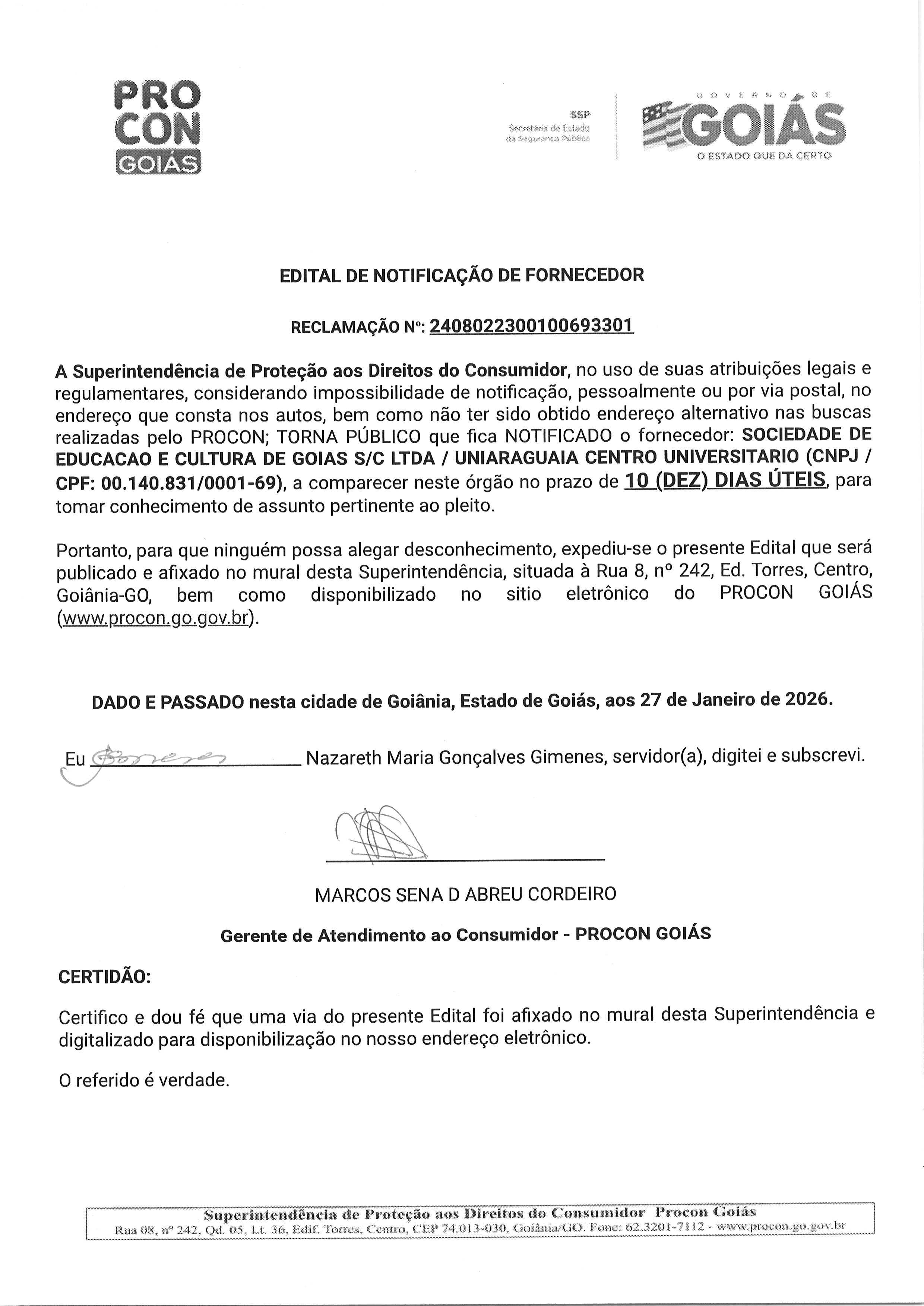 EDITAL DE NOTIFICACAO FORNECEDOR N° 2408022300100693301 SOCIEDADE DE EDUCAÇÃO E CULTURA DE GOIAS Última Atualização em 2 de fevereiro de 2026 Categoria Editais de Notificação, Fornecedor