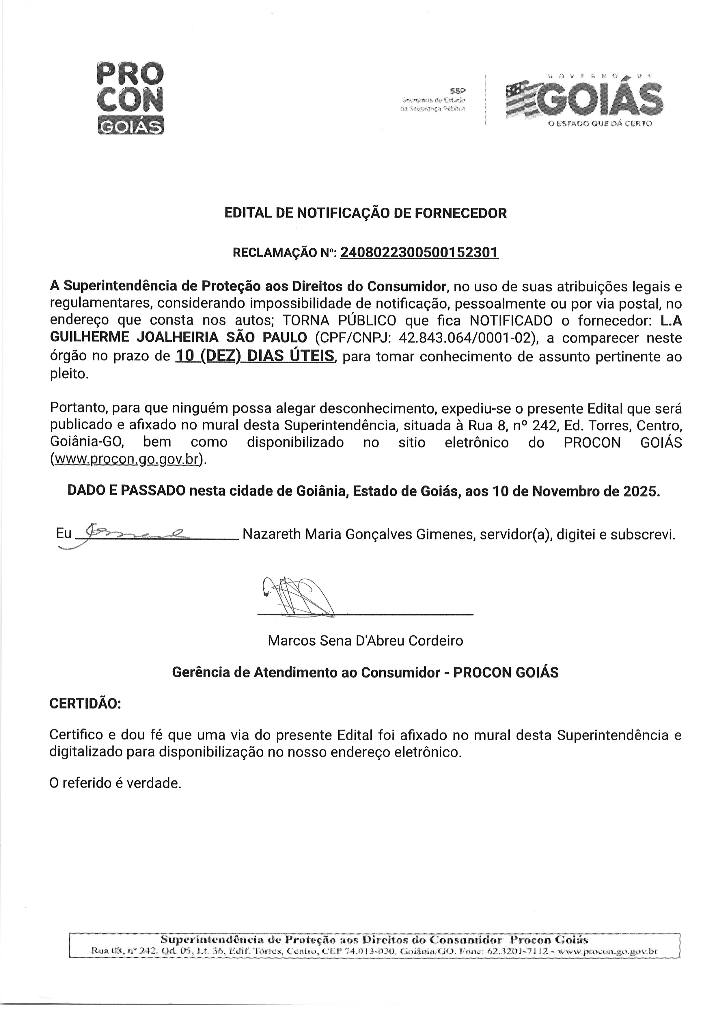 EDITAL DE NOTIFICACAO FORNECEDOR N° 2408022300500152301 FORNECEDOR L.A GUILHERME JOALHERIA Última Atualização em 18 de novembro de 2025 Categoria Editais de Notificação, Fornecedor