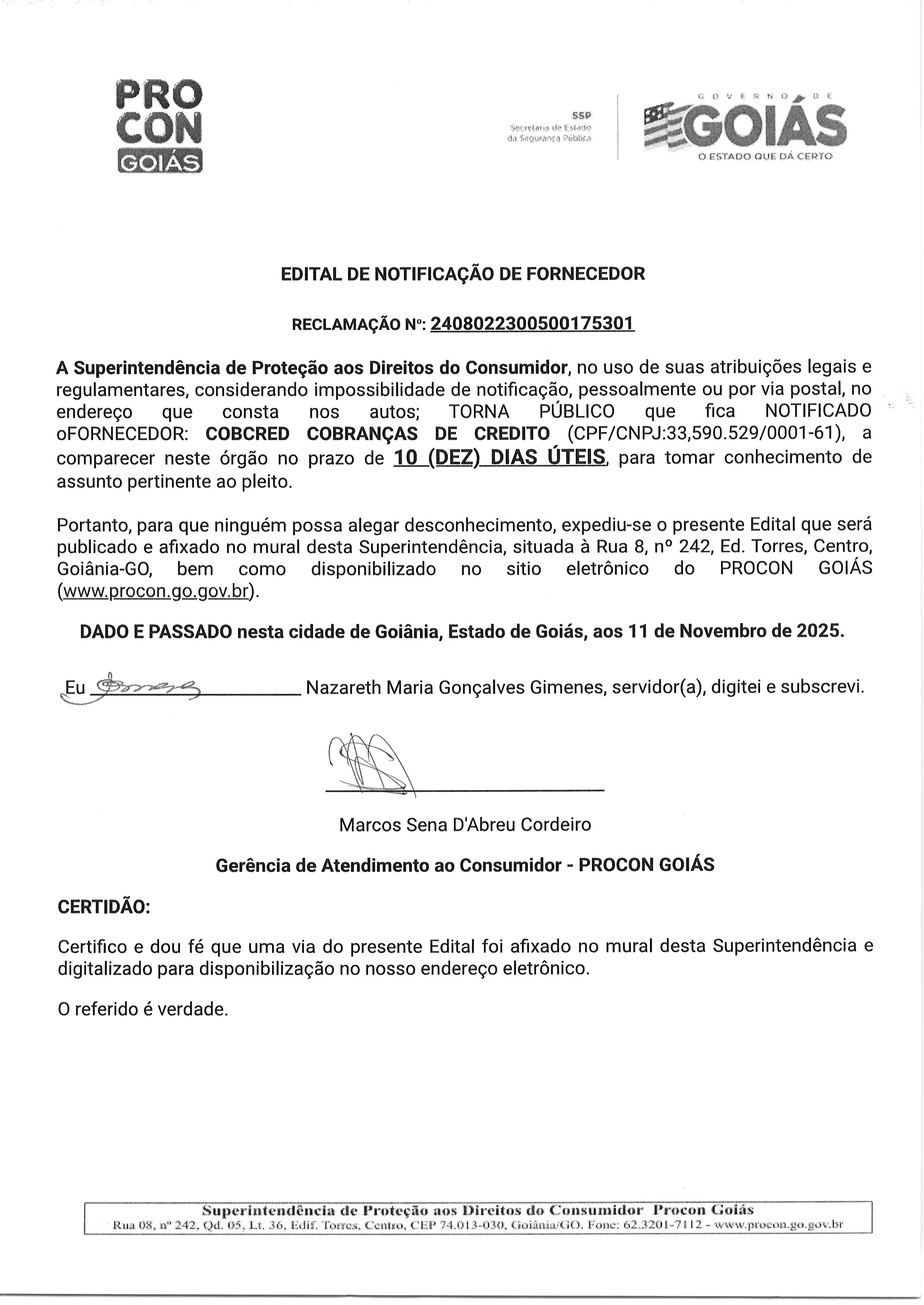 EDITAL DE NOTIFICACAO FORNECEDOR N° 2408022300500175301 FORNECEDOR COBCRED COBRANCAS DE CREDITO Última Atualização em 17 de novembro de 2025 Categoria Editais de Notificação, Fornecedor