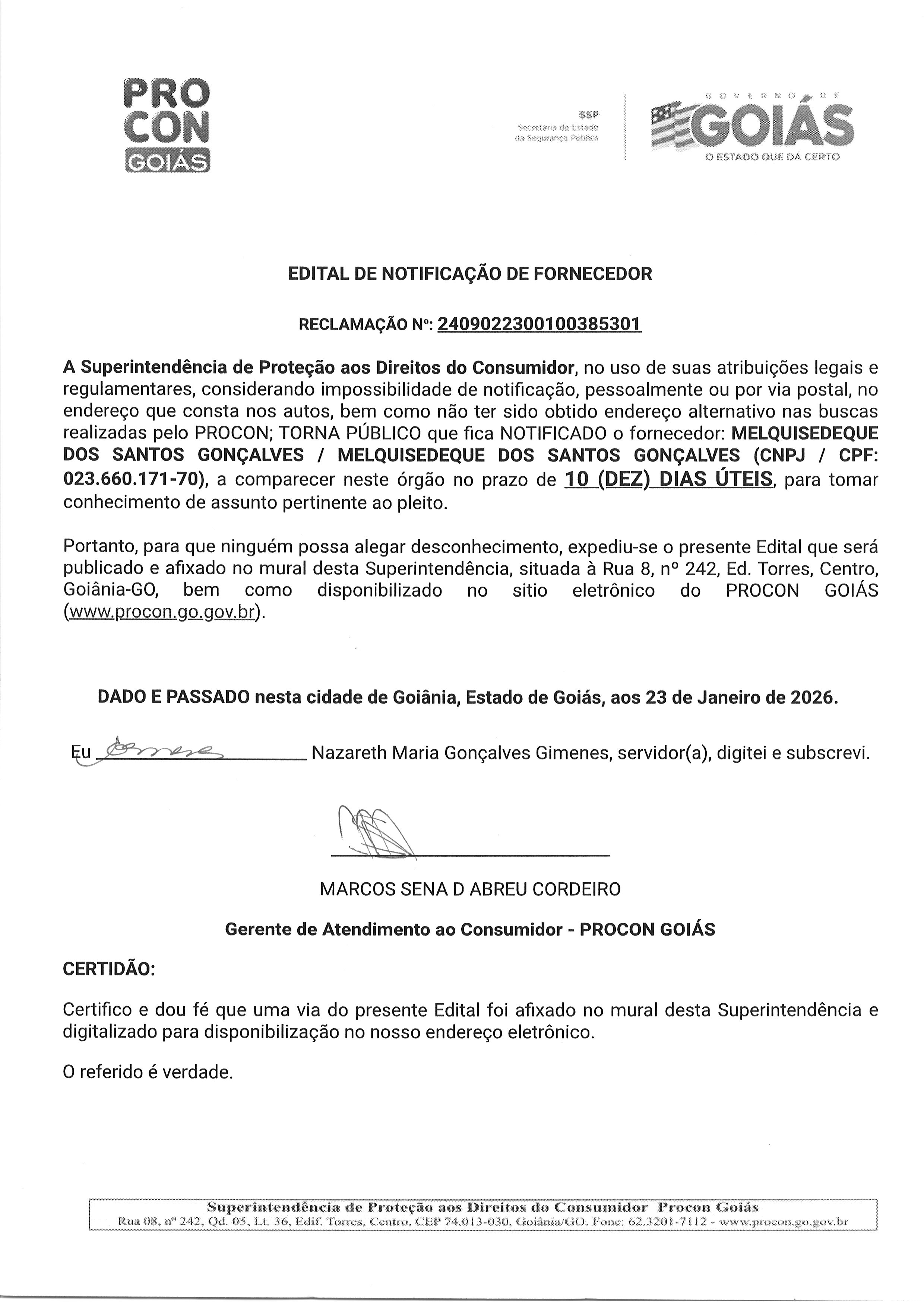 EDITAL DE NOTIFICACAO FORNECEDOR N° 2409022300100385301 MELQUISEDEQUE DOS SANTOS GONÇALVES Última Atualização em 3 de fevereiro de 2026 Categoria Editais de Notificação, Fornecedor