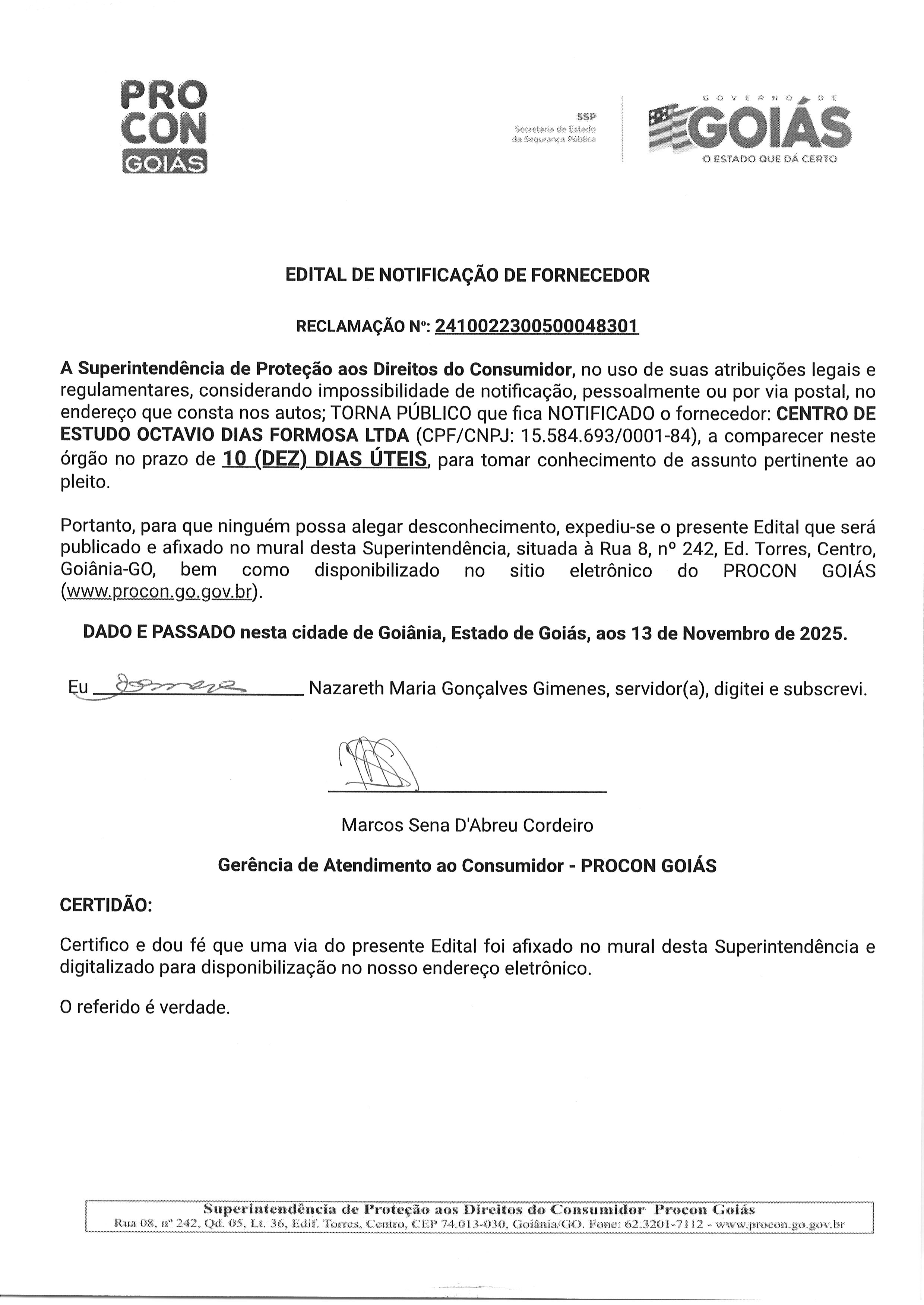 EDITAL DE NOTIFICACAO FORNECEDOR N° 2410022300500048301 FORNECEDOR CENTRO DE ESTUDO OCTAVIO DIAS FORMOSA Última Atualização em 19 de novembro de 2025 Categoria Editais de Notificação, Fornecedor