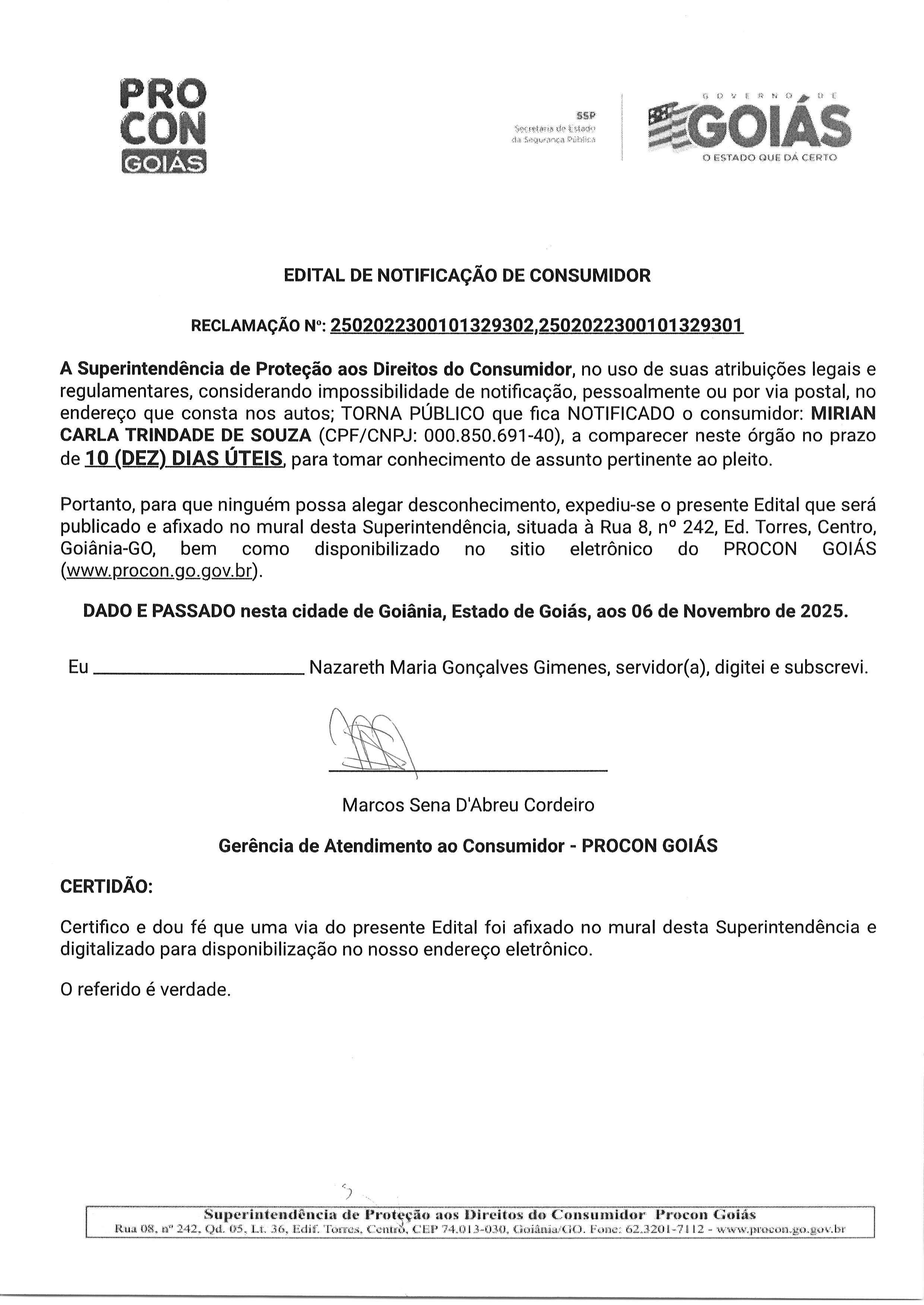 EDITAL DE NOTIFICACAO FORNECEDOR N° 2502022300101329302 CONSUMIDOR MIRIAN CARLA TRINDADE DE SOUZA Última Atualização em 13 de novembro de 2025 Categoria Consumidor, Editais de Notificação