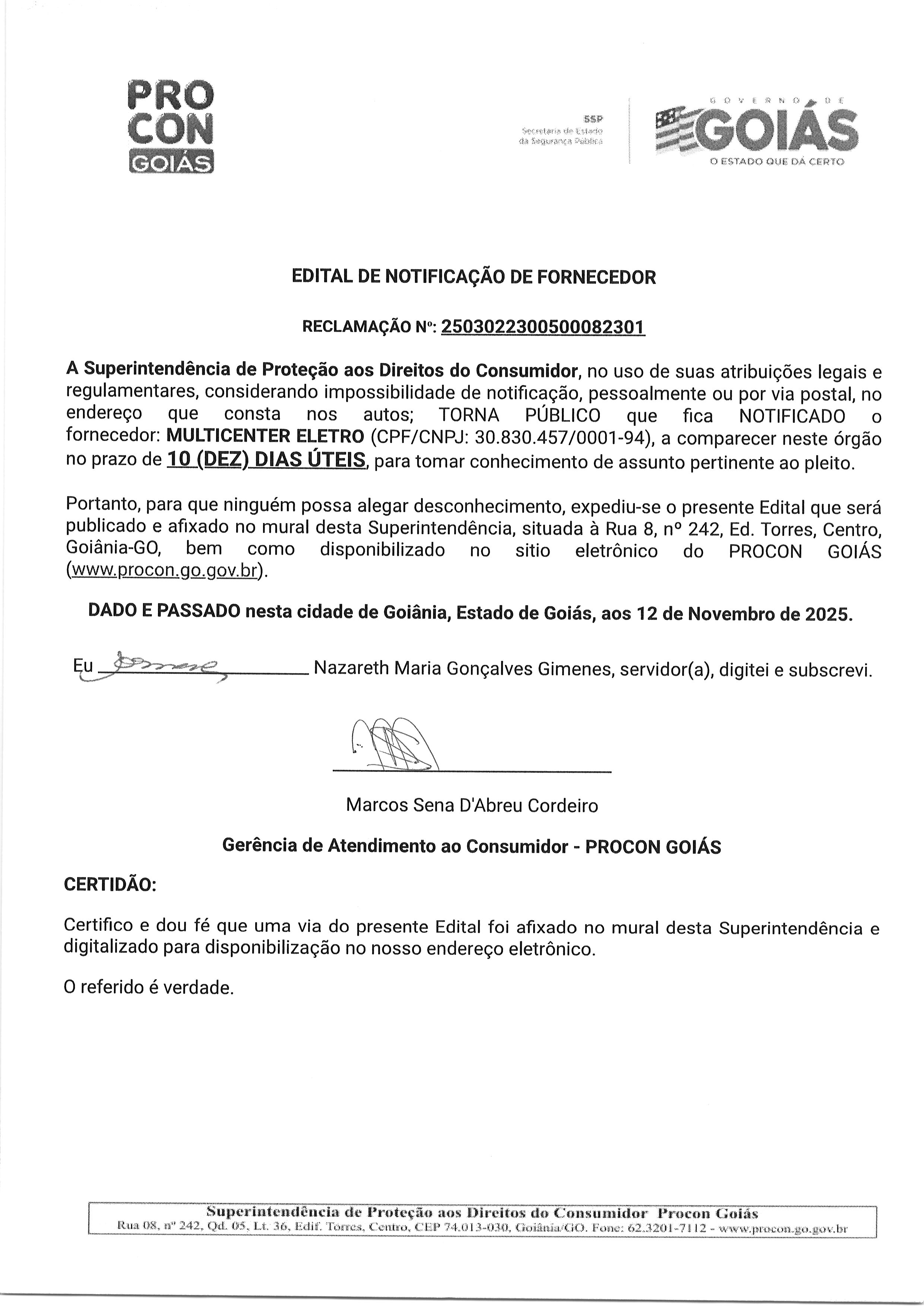EDITAL DE NOTIFICACAO FORNECEDOR N° 2503022300500082301 FORNECEDOR MULTICENTER ELETRO Última Atualização em 19 de novembro de 2025 Categoria Editais de Notificação, Fornecedor