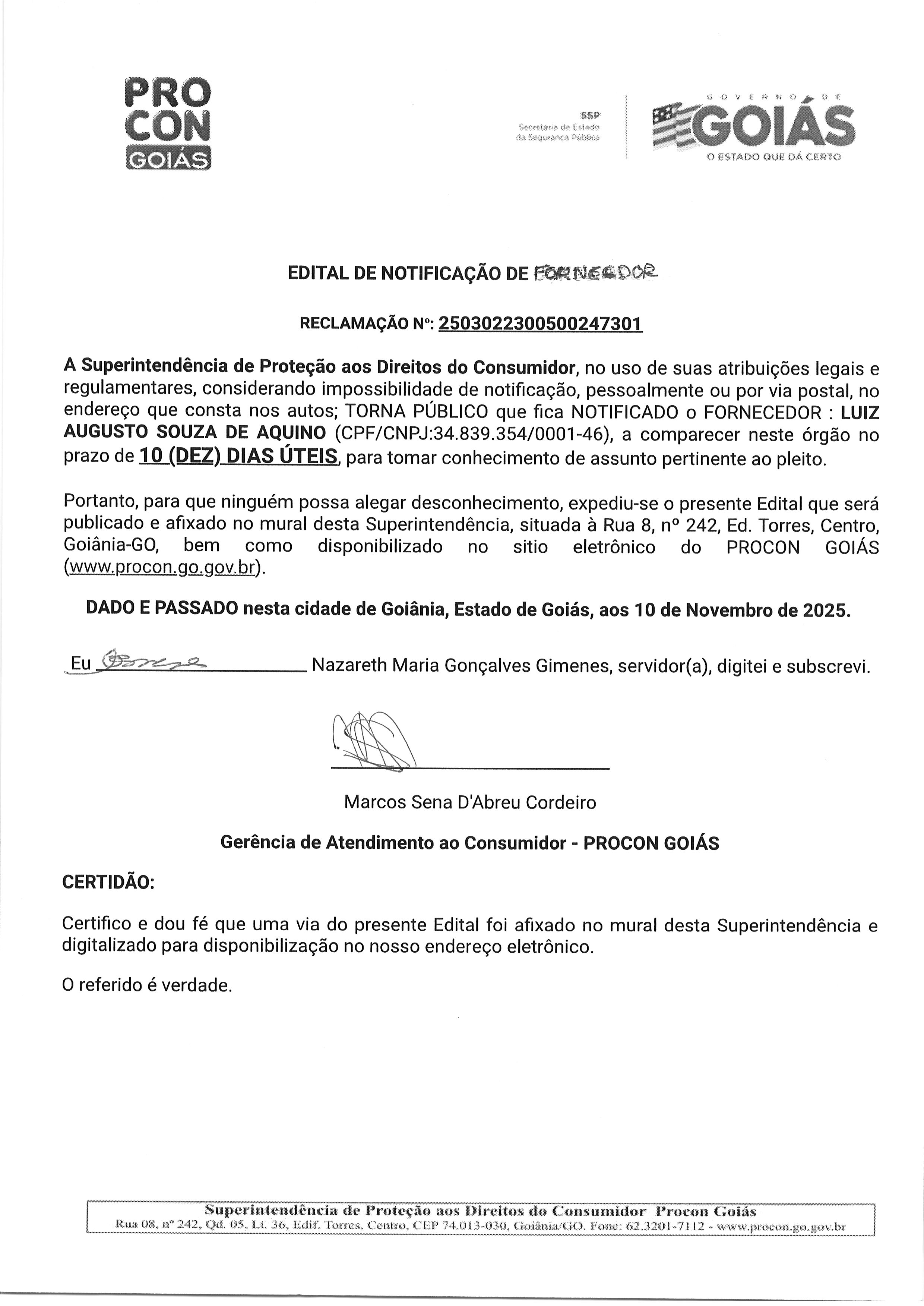 EDITAL DE NOTIFICACAO FORNECEDOR N° 2503022300500247301 FORNECEDOR LUIZ AUGUSTO SOUZA DE AQUINO Última Atualização em 17 de novembro de 2025 Categoria Editais de Notificação, Fornecedor