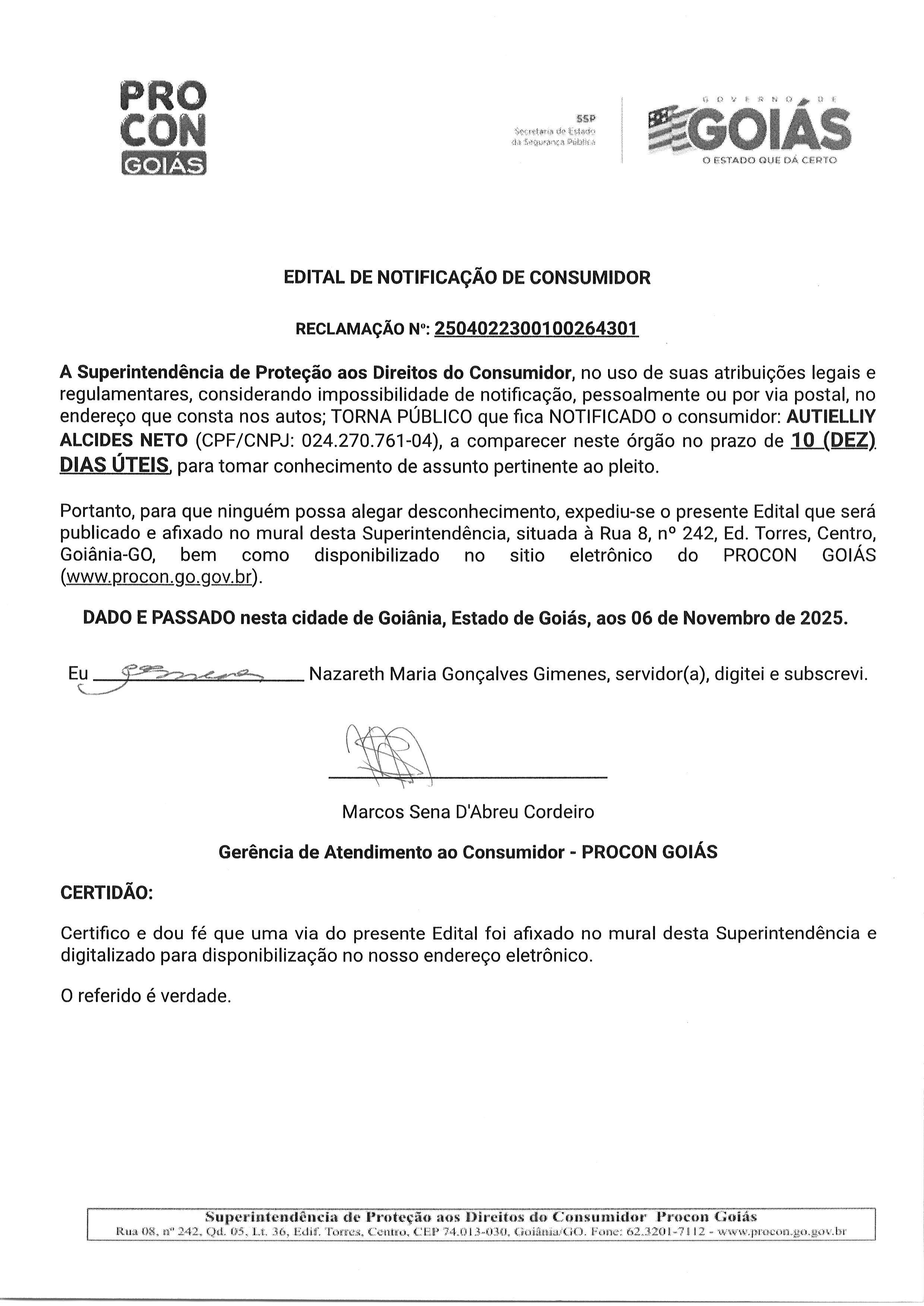EDITAL DE NOTIFICACAO FORNECEDOR N° 2504022300100264301 CONSUMIDOR AUTIELLIY ALCIDES NETO Última Atualização em 13 de novembro de 2025 Categoria Consumidor, Editais de Notificação