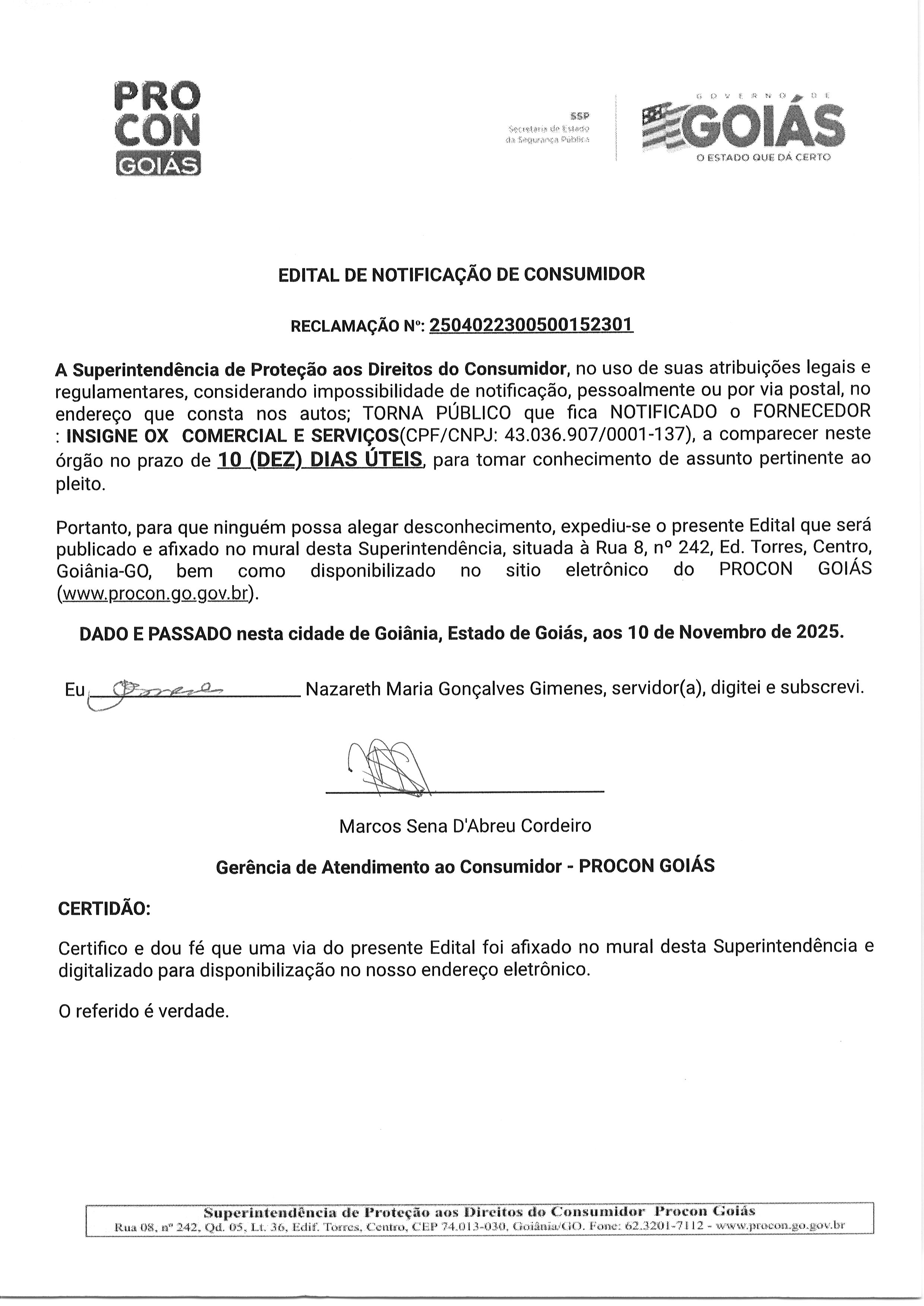 EDITAL DE NOTIFICACAO FORNECEDOR N° 2504022300500152301 FORNECEDOR INSIGNE OX COMERCIAL Última Atualização em 17 de novembro de 2025 Categoria Editais de Notificação, Fornecedor