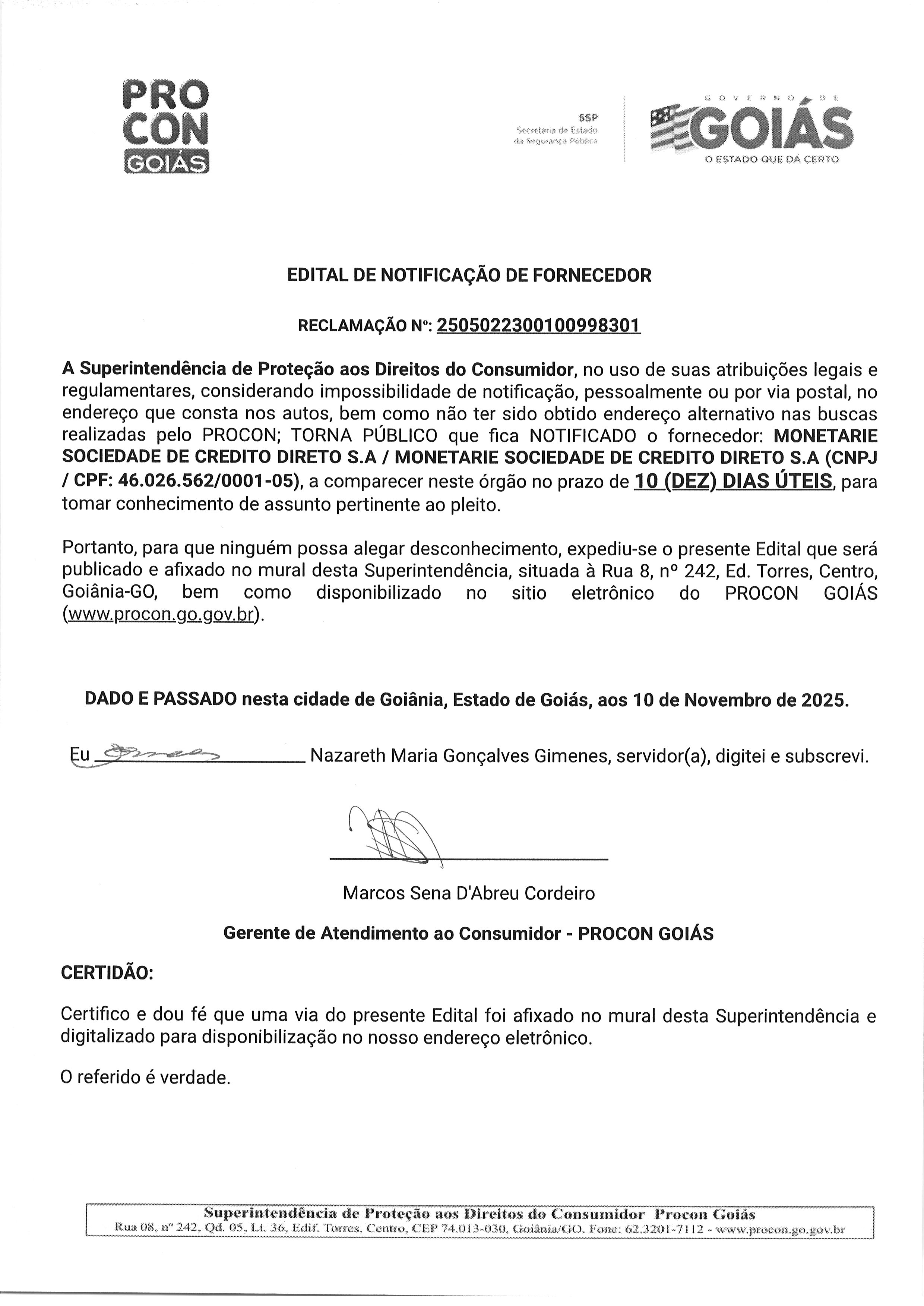 EDITAL DE NOTIFICACAO FORNECEDOR N° 2505022300100998301 FORNECEDOR MONETARIE SOCIEDADE DE CREDITO DIRETO Última Atualização em 17 de novembro de 2025 Categoria Editais de Notificação, Fornecedor