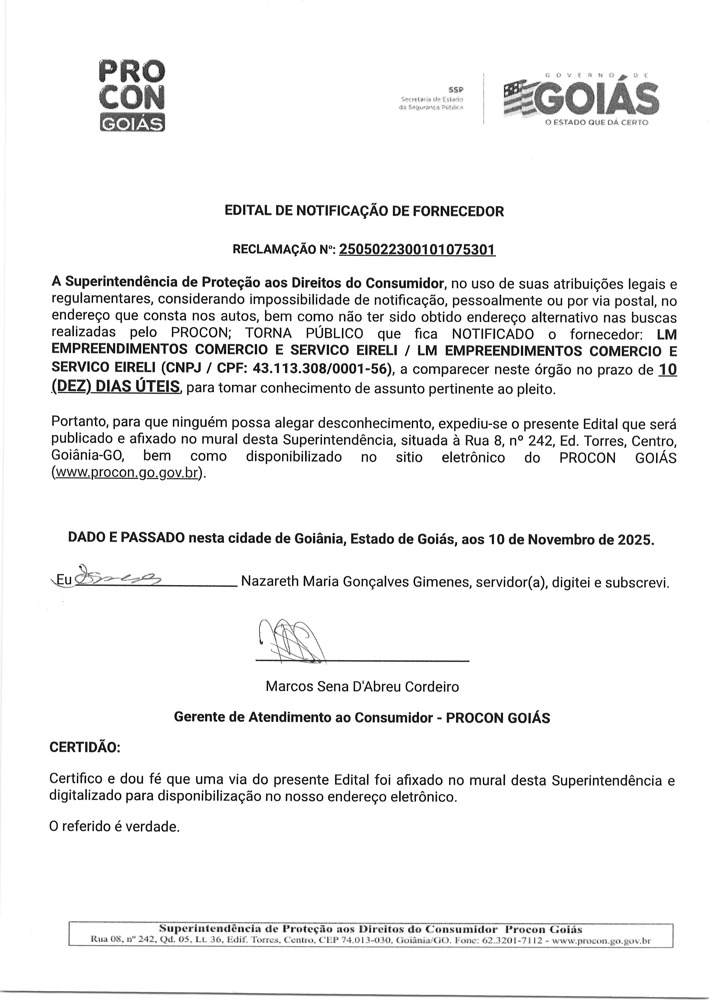 EDITAL DE NOTIFICACAO FORNECEDOR N° 2505022300101075301 FORNECEDOR LM EMPREENDIMENTOS COMERCIO Última Atualização em 18 de novembro de 2025 Categoria Editais de Notificação, Fornecedor