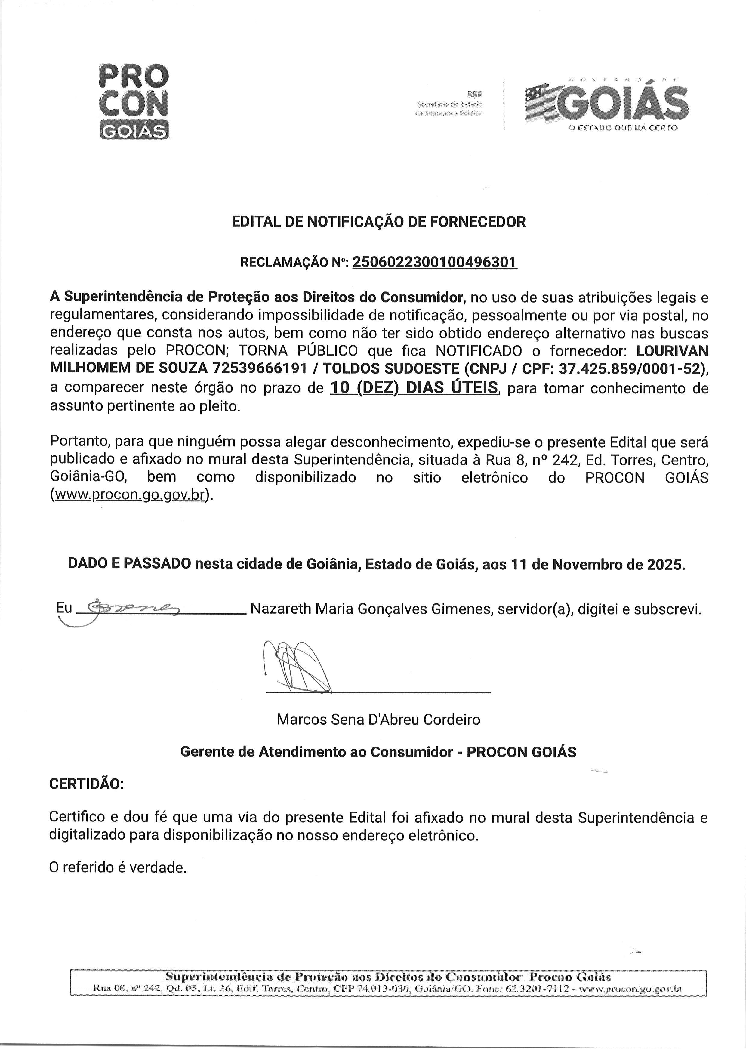 EDITAL DE NOTIFICACAO FORNECEDOR N° 2506022300100496301 FORNECEDOR LOURIVAN MILHOMEM DE SOUZA Última Atualização em 17 de novembro de 2025 Categoria Editais de Notificação, Fornecedor
