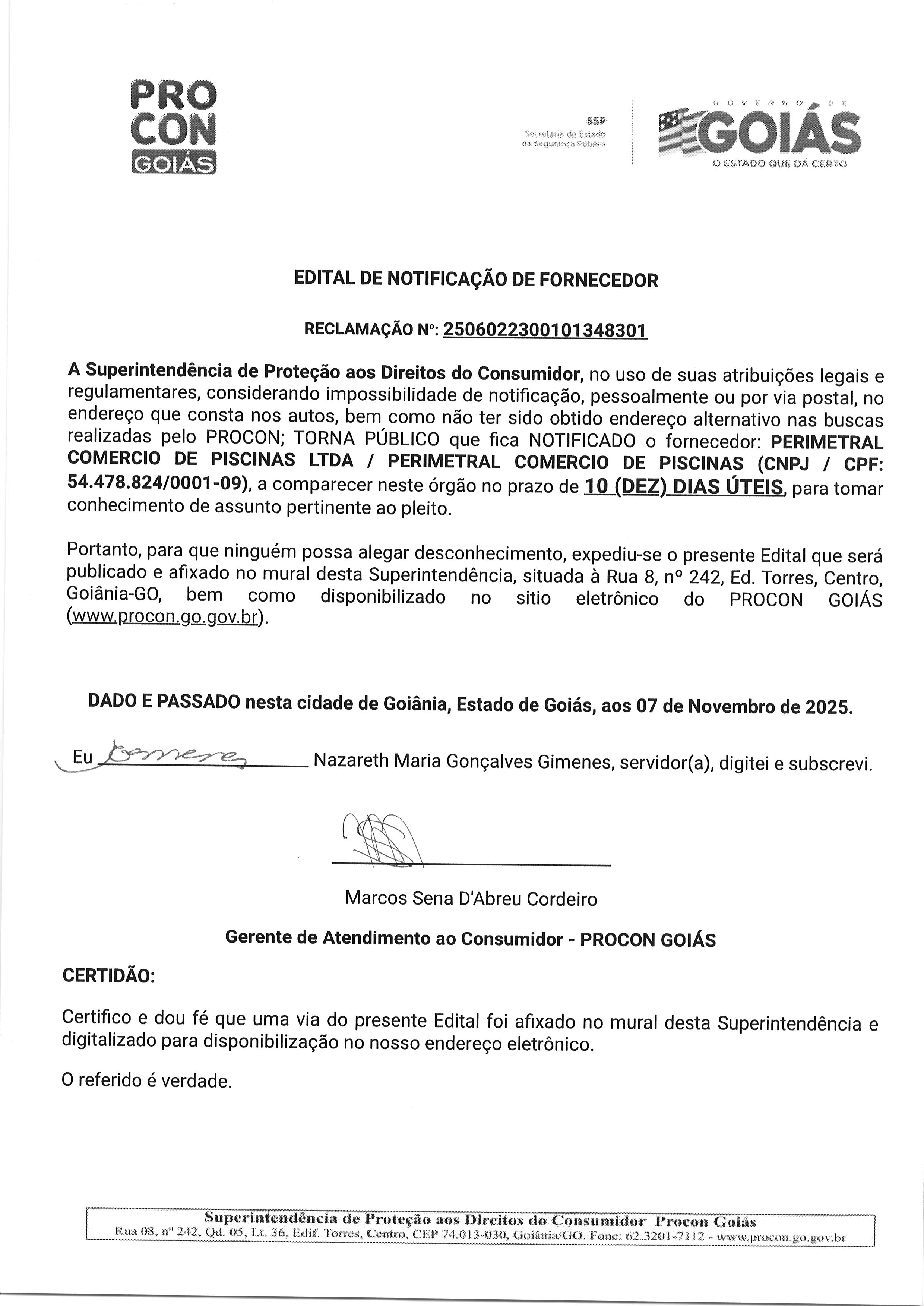 EDITAL DE NOTIFICACAO FORNECEDOR N° 2506022300101348301 FORNECEDOR PERIMETRAL COMERCIO DE PISCINAS Última Atualização em 12 de novembro de 2025 Categoria Editais de Notificação, Fornecedor