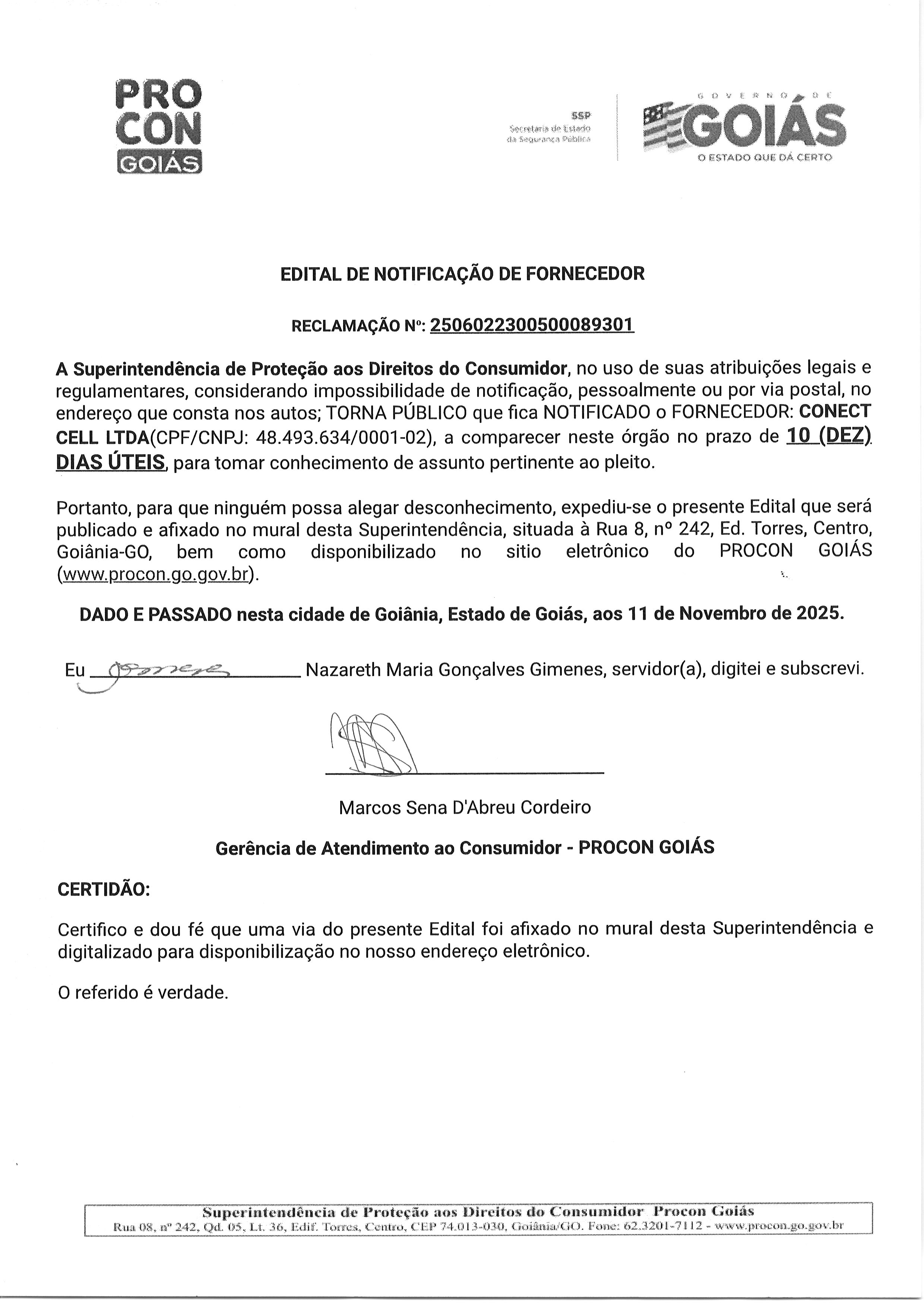 EDITAL DE NOTIFICACAO FORNECEDOR N° 2506022300500089301 FORNECEDOR CONECT CELL LTDA Última Atualização em 17 de novembro de 2025 Categoria Editais de Notificação, Fornecedor