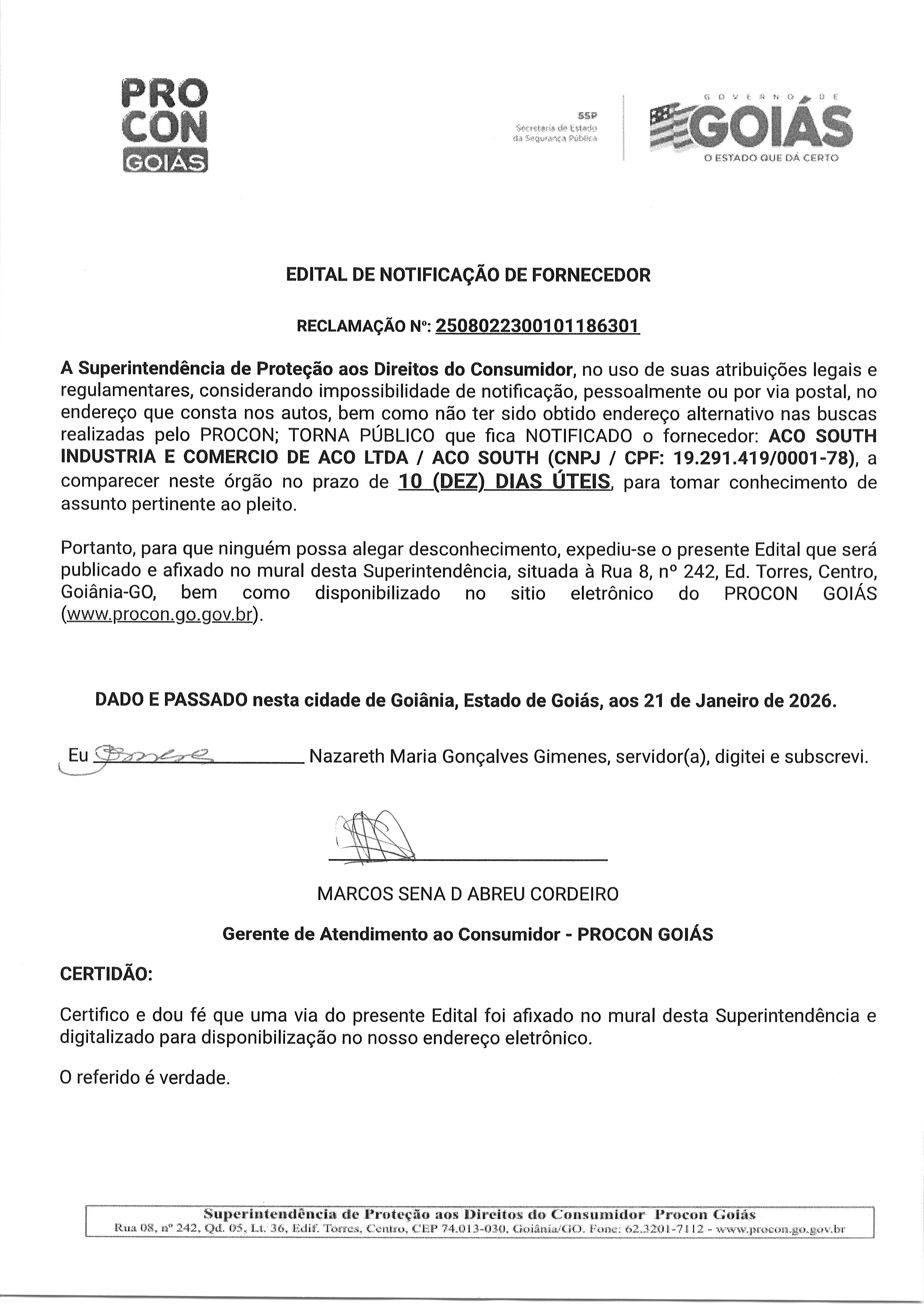 EDITAL DE NOTIFICACAO FORNECEDOR N° 2508022300101186301 ACO SOUTH INDUSTRIA E COMERCIO DE ACO Última Atualização em 29 de janeiro de 2026 Categoria Editais de Notificação, Fornecedor