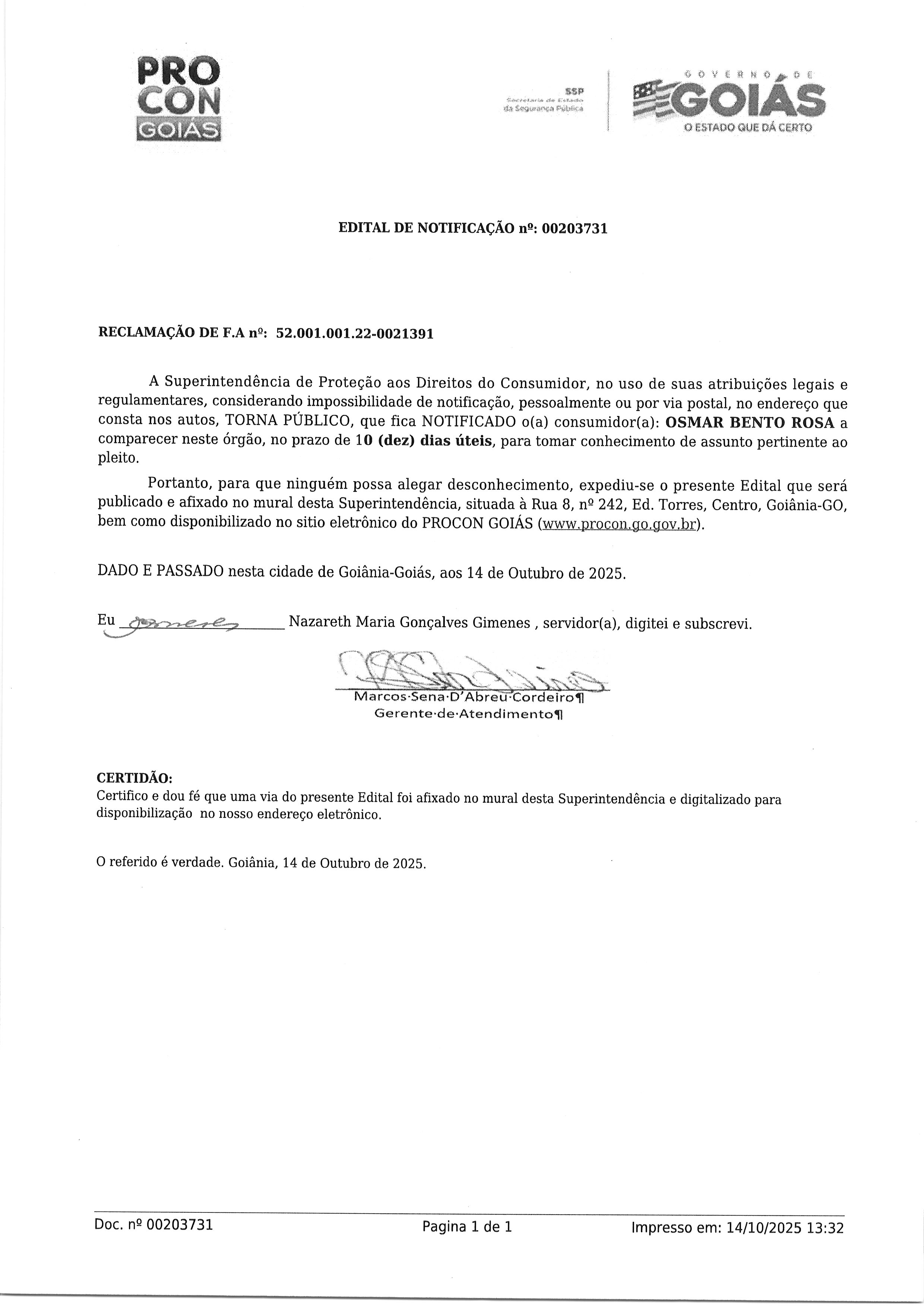EDITAL DE NOTIFICACAO N° 00203731 CONSUMIDOR OSMAR BENTO ROSA Última Atualização em 20 de outubro de 2025 Categoria Consumidor, Editais de Notificação