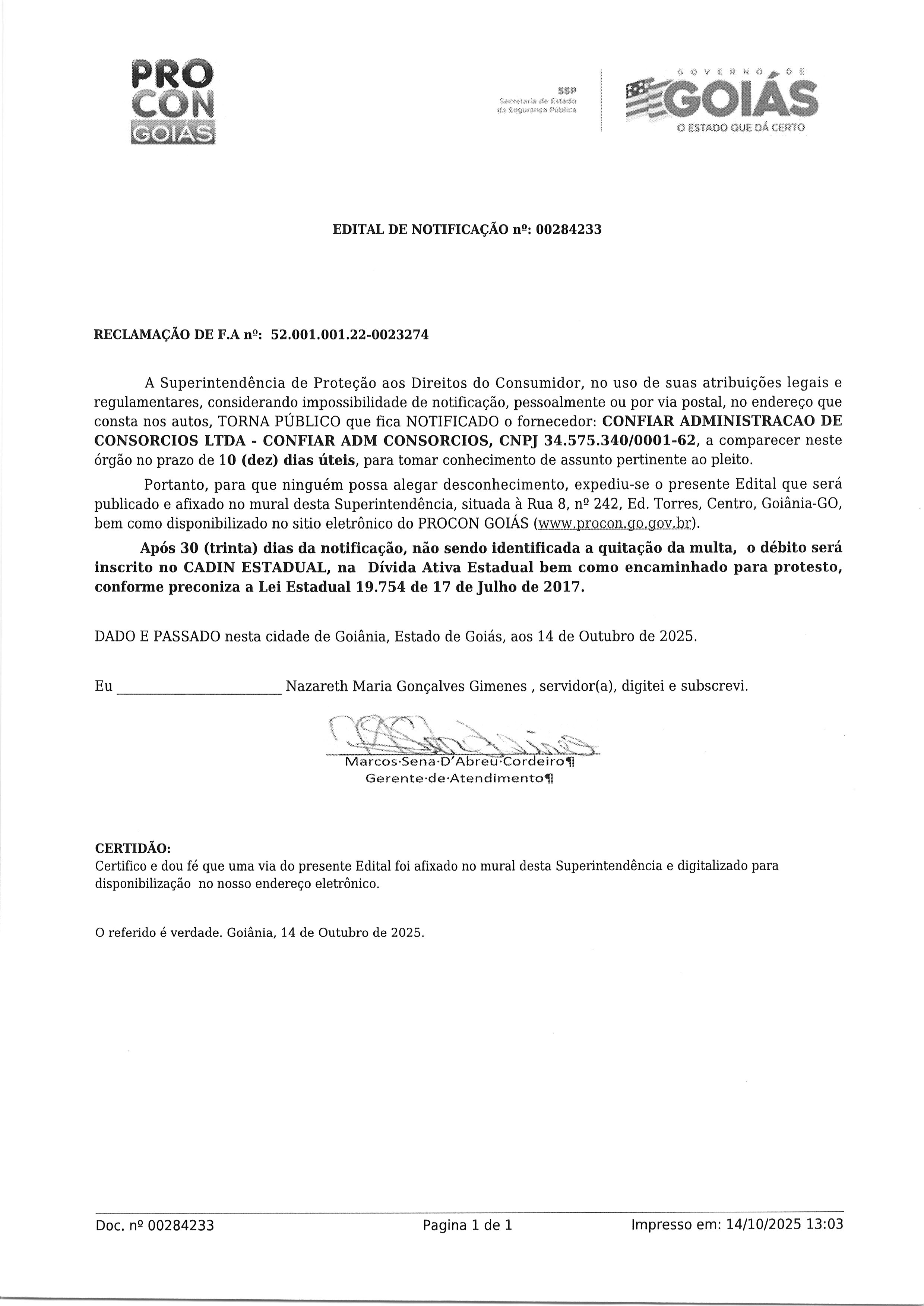 EDITAL DE NOTIFICACAO N° 00284233 FORNECEDOR CONFIAR ADMINISTRACAO DE CONSORCIOS Última Atualização em 21 de outubro de 2025 Categoria Editais de Notificação, Fornecedor