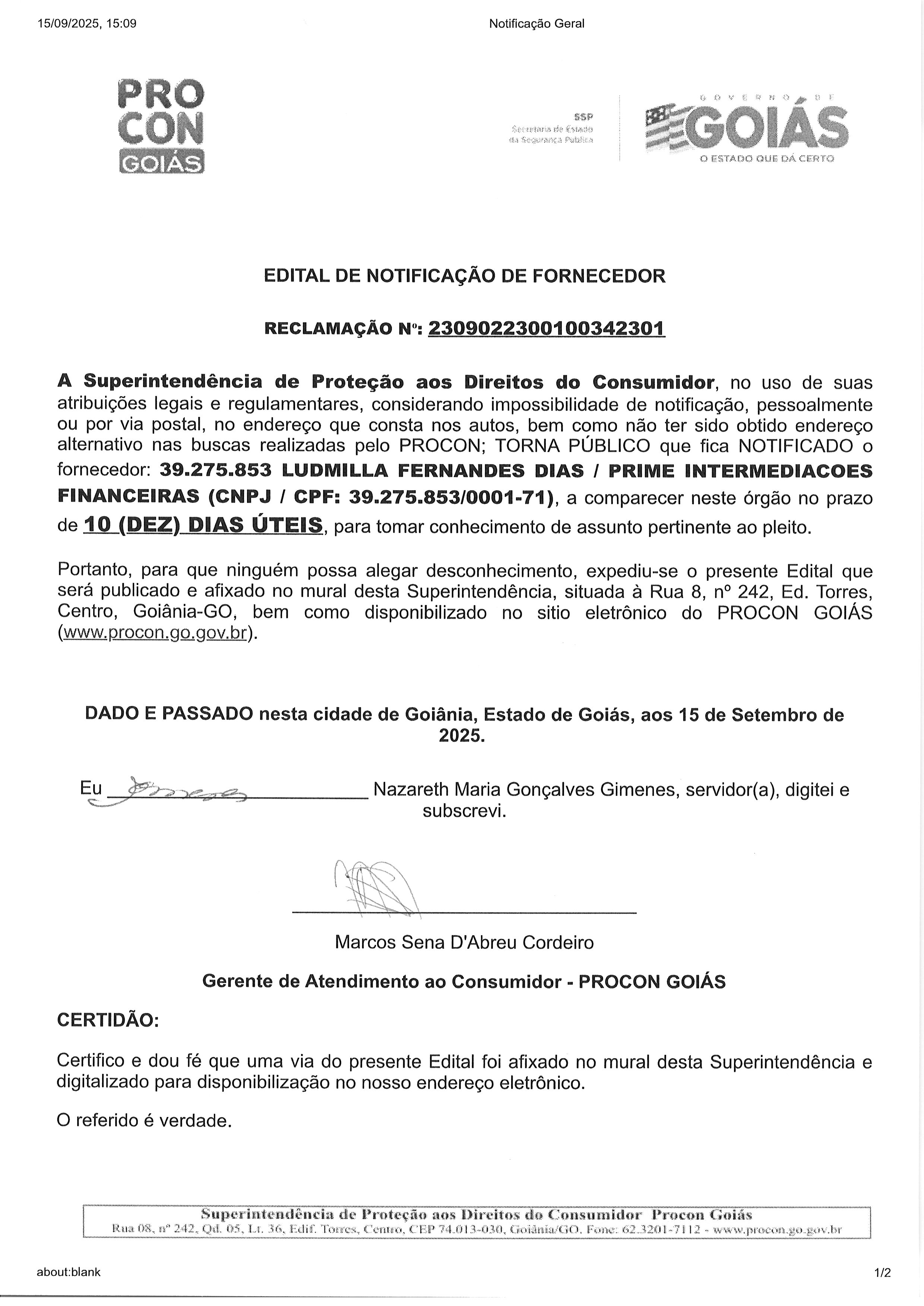 Edital de Notificação N° 2309022300100342301 , FORNECEDOR 39.275.853 LUDMILLA FERNANDES DIAS Última Atualização em 6 de outubro de 2025 Categoria Consumidor, Editais de Notificação