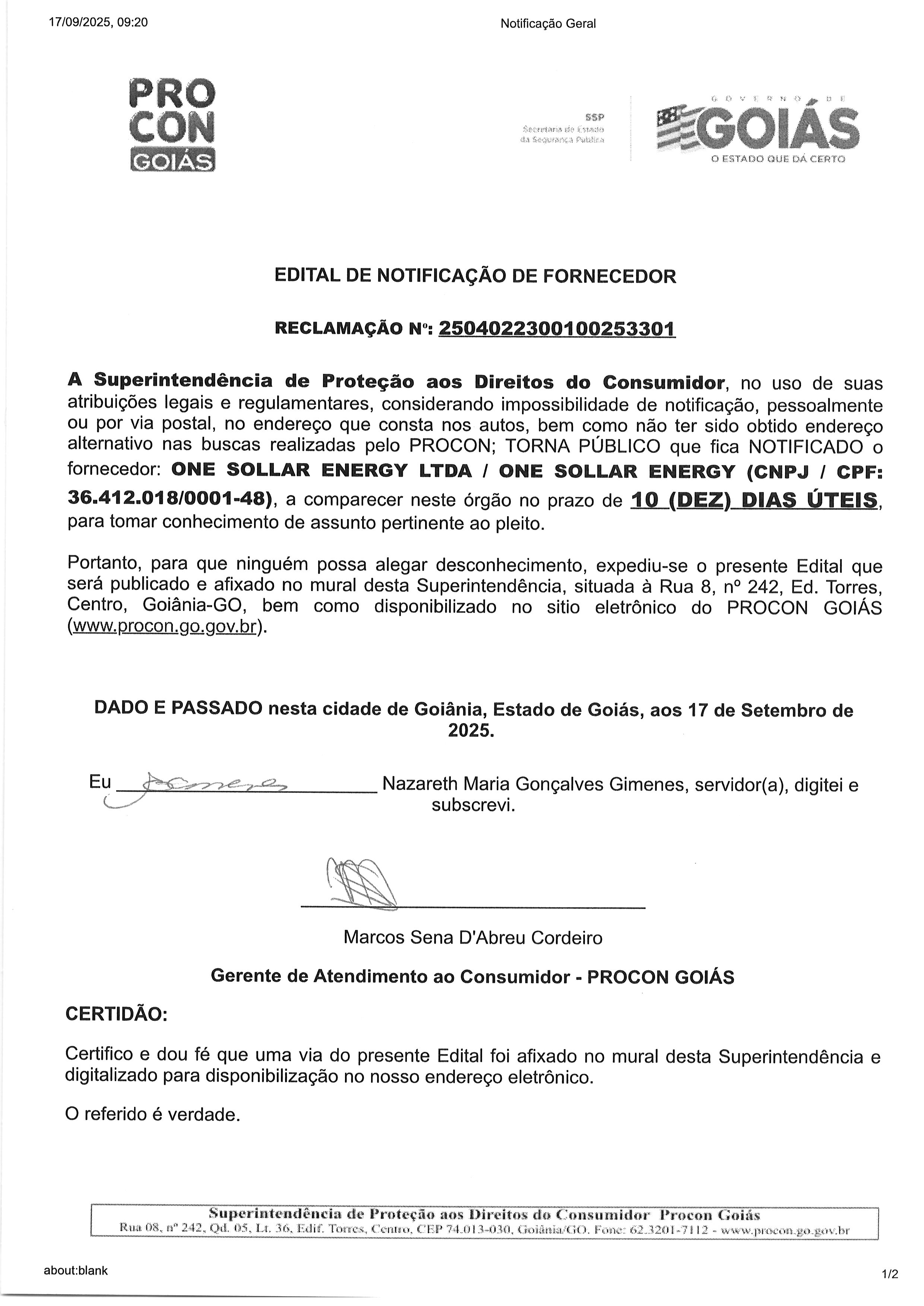 Edital de Notificação N° 2504022300100253301, FORNECEDOR ONE SOLLAR ENERGY LTDA Última Atualização em 6 de outubro de 2025 Categoria Consumidor, Editais de Notificação